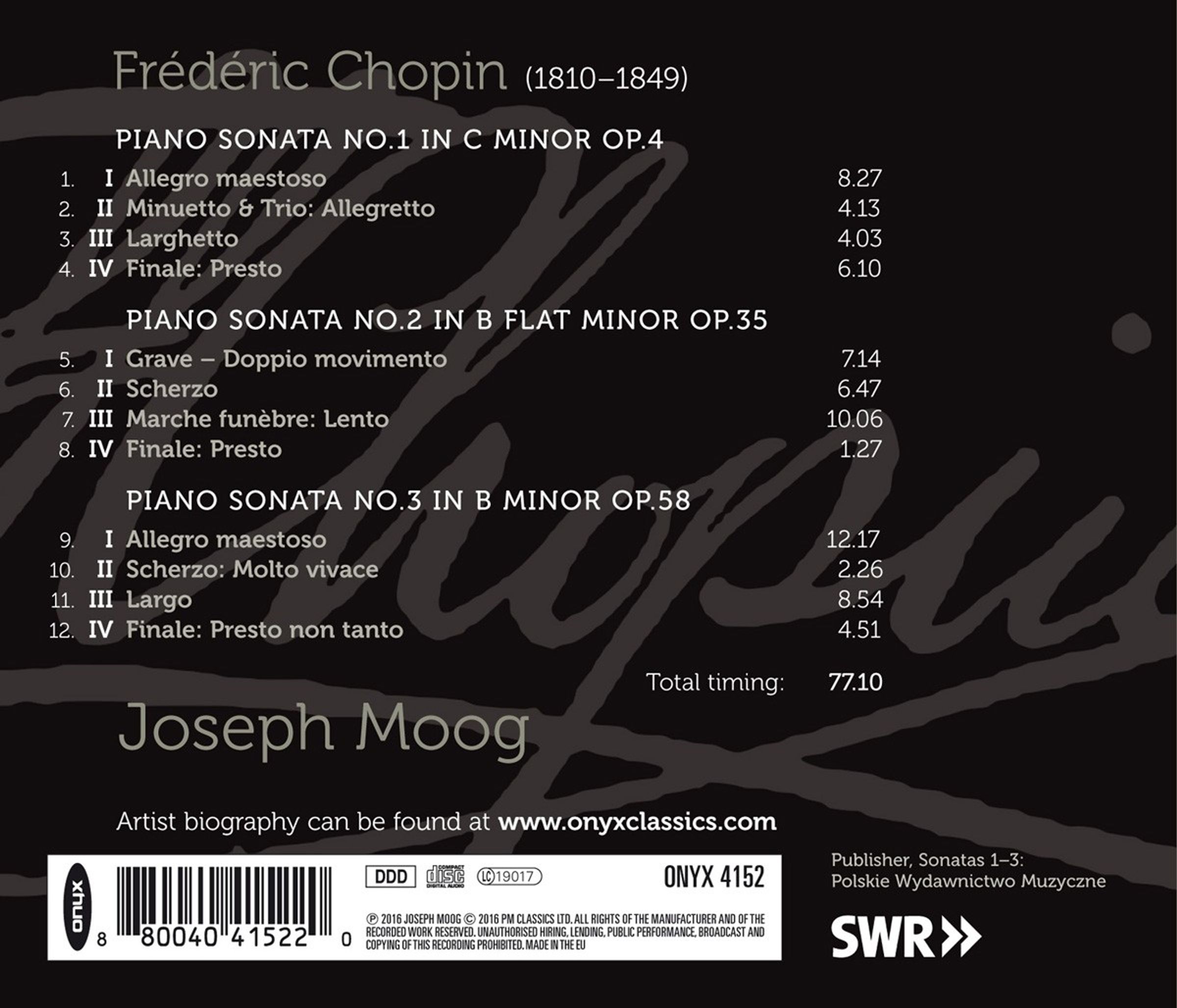 Längst ist Joseph Moog unter Musikfreunden kein Geheimtipp mehr: 2015 wurde er vom Gramophone Magazine zum »Young Artist of the Year« gekürt und im gleichen Jahr für seine Aufnahme der Konzerte von Moszkowski und Grieg für einen Grammy nominiert. Für ONYX hat er jetzt die drei Klaviersonaten von Frédéric Chopin eingespielt, die nicht zuletzt zeigen, dass er auch bei Standardrepertoire außergewöhnliche und preisverdächtige Einspielungen vorzulegen im Stande ist.