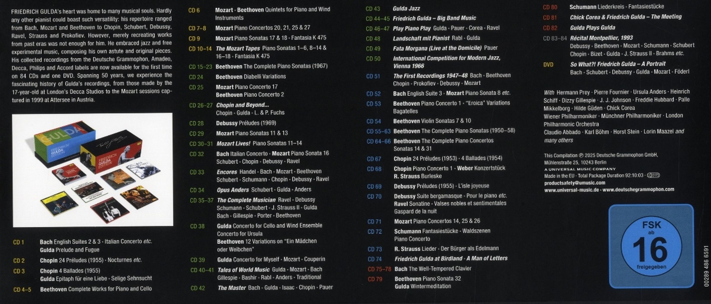 Auf 84 CDs und einer DVD erscheinen nun zum ersten Mal seine gesammelten Aufnahmen der Labels Deutsche Grammophon, Amadeo, Decca, Philips und Accord in einer Box mit Original-Covern. Wir erleben 50 Jahre Aufnahmegeschichte: von den Einspielungen des 17-Jährigen aus den Londoner Decca-Studios bis zu den 1999 am österreichischen Attersee entstandenen Mozart-Aufnahmen. Neben zahlreichen CD-Premieren findet sich auch die Erstveröffentlichung einer verschollen geglaubten Bach-Toccata aus dem Jahr 1947. Zwei Gesamtzyklen der Beethoven-Sonaten sowie der Préludes von Debussy laden zu einem spannenden Hörvergleich ein. Ein ausführliches Booklet mit Essays von Gulda-Biografin Irene Suchy und Reinhard Brembeck sowie zahlreichen Fotos vervollständigt das Porträt.
