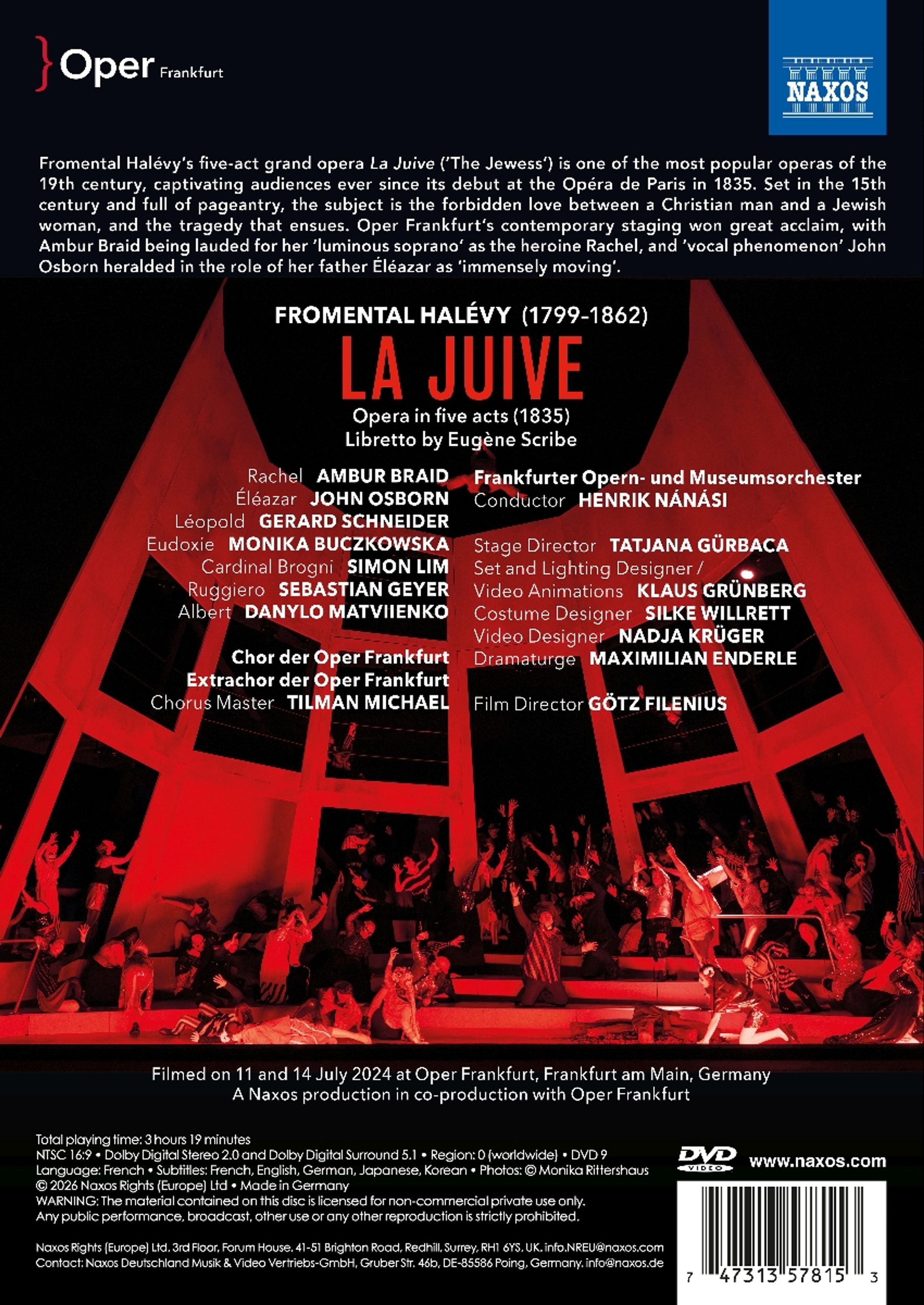 Fromental Halevys fünfaktige Grand Opera "La Juive" (Die Judin) ist eine der beliebtesten Opern des 19. Jahrhunderts und begeistert seit ihrer Uraufführung an der Opera de Paris im Jahr 1835 das Publikum. Das im 15. Jahrhundert angesiedelte, prunkvolle Werk handelt von der verbotenen Liebe zwischen einem christlichen Mann und einer jüdischen Frau und der Tragödie, die daraus entsteht. Die zeitgenössische Inszenierung der Oper Frankfurt wurde mit großem Beifall aufgenommen, wobei die zunehmend gefragte kanadische Sopranistin Ambur Braid für ihre 'strahlende Sopranstimme' als Heldin Rachel gelobt wurde und das 'Stimmphänomen' John Osborn in der Rolle ihres Vaters Eleazar als 'unheimlich bewegend' gepriesen wurde. Dirigent Henrik Nanasi und das Orchester präsentieren sich in bester Spielfreude und auch der Opernchor überzeugt. Tatjana Gürbaca, einige Jahre lang Operndirektorin am Staatstheater Mainz, inszenierte die Geschichte psychologisch ausgefeilt. Sie arbeitet an großen Opernhäusern im deutschsprachigen Raum und darüber hinaus.