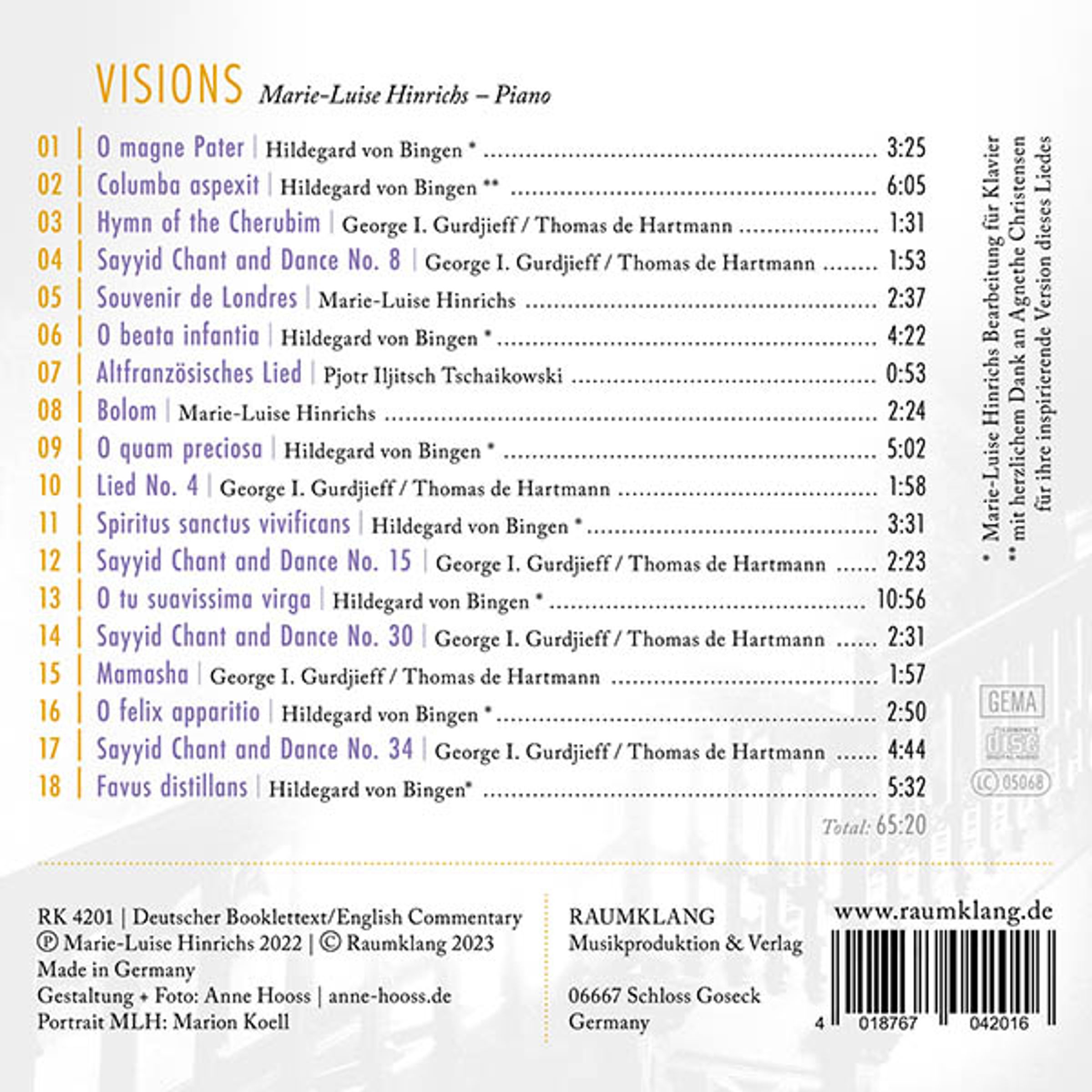 Nach dem internationalen Erfolg von »Vocation« hat Marie-Luise Hinrichs erneut puristische Impressionen zu Liedern der Hildegard von Bingen komponiert. Sie spannt einen Bogen in die heutige Zeit und überträgt die fließende Weite dieser Musik auf ihr Instrument, das Klavier. Als wäre Hildegards Musik dafür geschaffen, improvisiert Hinrichs dazu eigene Harmonien und Melodien, erfindet neue Techniken – das Zupfen der Saiten oder Tremoli auf einem einzigen Ton – und lässt so ihre »Klaviergesänge« entstehen. Darüber hinaus interpretiert die sensible Pianistin Kompositionen des charismatischen Meisters G. I. Gurdjieff.