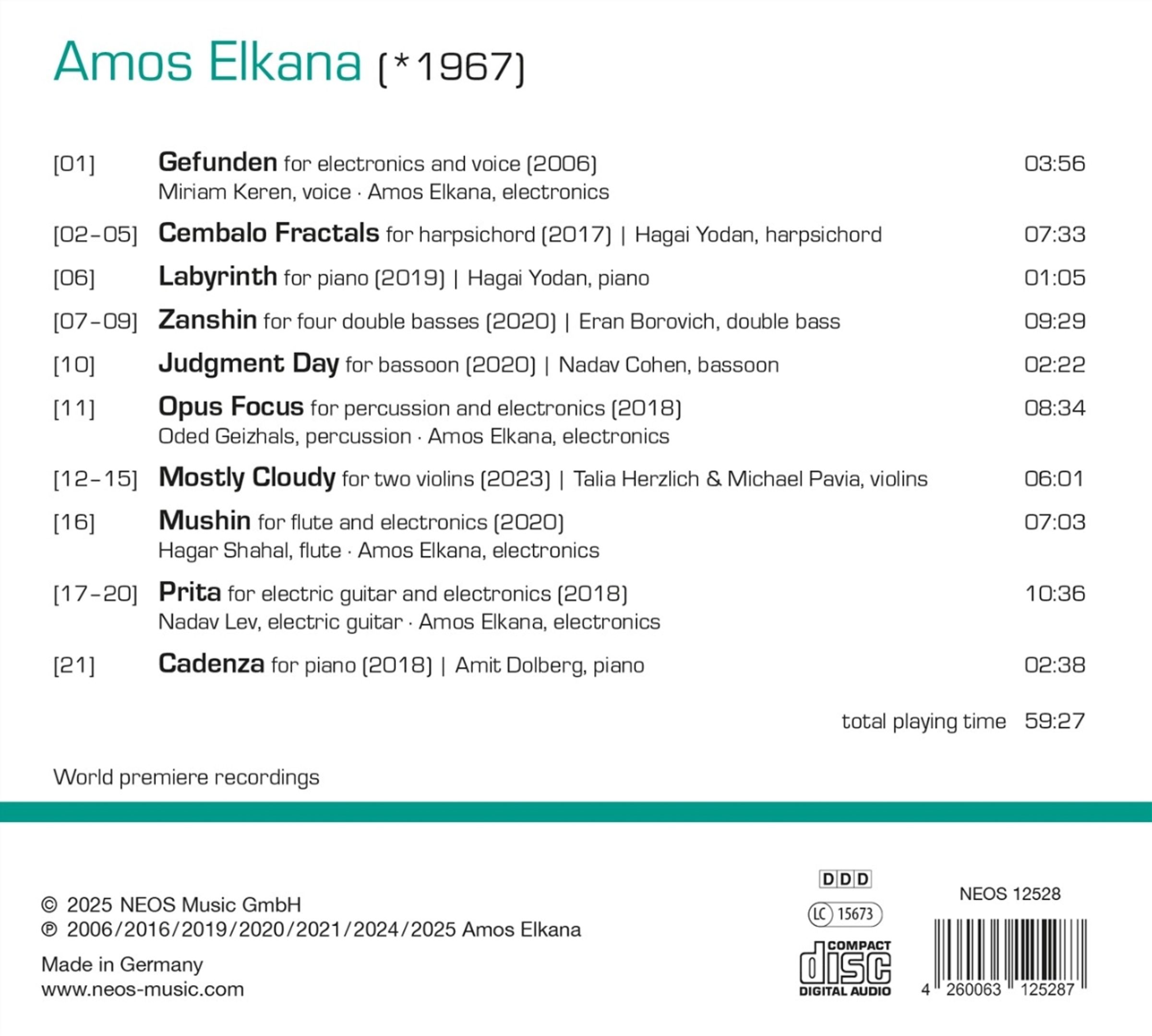 Gefunden für Elektronik & Stimme; Cembalo Fractals für Cembalo; Labyrinth für Klavier; Zanshin für 4 Kontrabässe; Judgment Day für Fagott; Opus Focus für Percussion & Elektronik; Mostly cloudy für 2 Violinen; Mushin für Flöte & Elektronik; Prita für E-Gitarre & Elektronik; Cadenza für Klavier