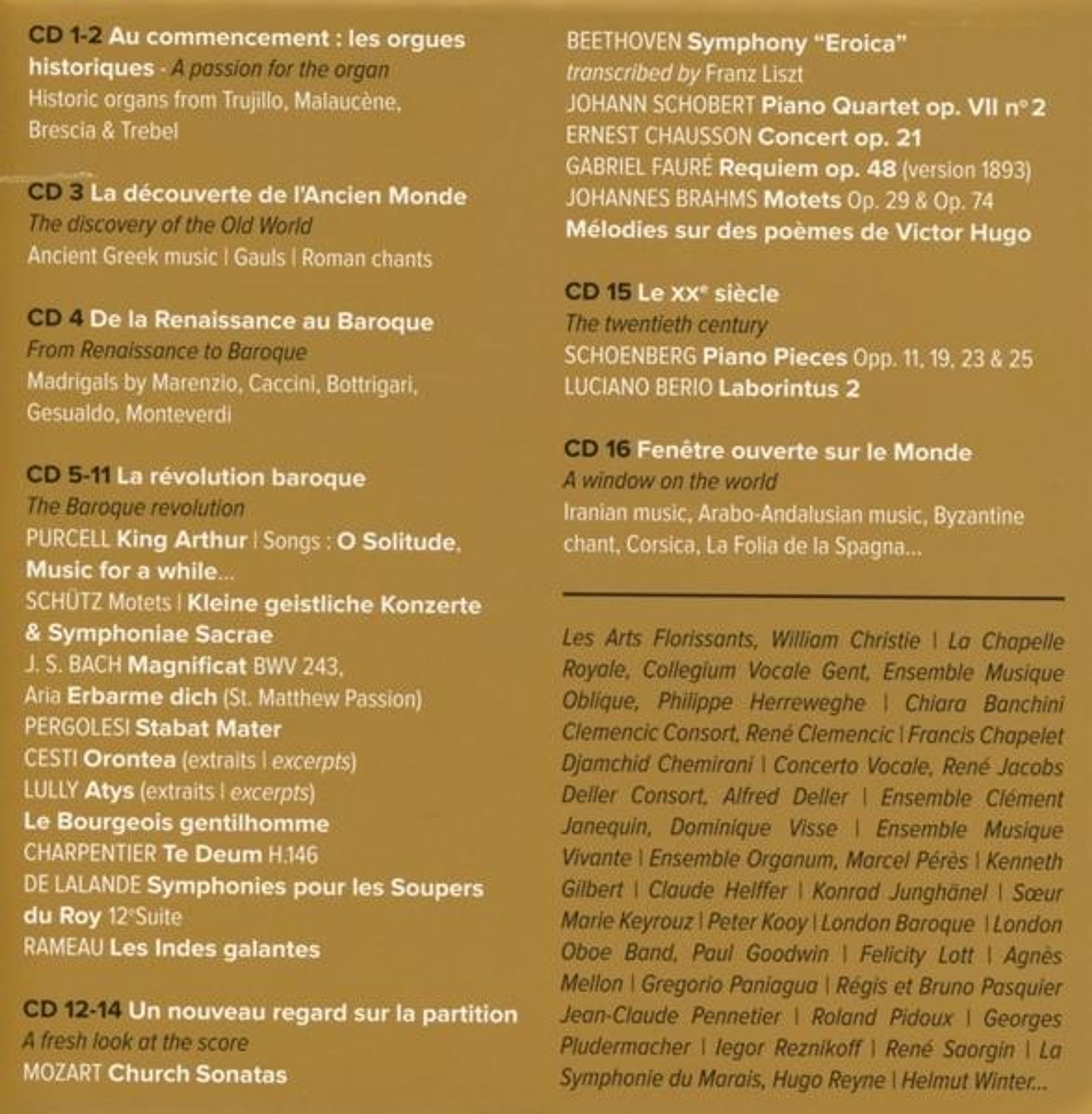 - Barbara Schlick, Felicity Lott, Christiane Legrand, Claudine Meunier, Peter Kooy, Gerard Lesne, Agnes Mellon, Alfred Deller, Guillemette Laurens, Regis Pasquier, Jean-Claude Pennetier, Bruno Pasquier, Graham Johnson, Robert Spencer, Claude Helffer, William Christie, Kenneth Gilbert, Georges Pludermacher, Konrad Junghänel, Francis Chaplet, Rene Saorgin, Helmut Winter, Concerto Vocale, Deller Consort, Collegium Vocale Gent, Chorale Experimentale, Atrium Musicae de Madrid, Ensemble Organum, Clemencic Consort, The King's Musick, La Chapelle Royale, Les Arts Florissants, La Simphonie du Marais, London Baroque, Ensemble Musique Vivante, Gregorio Paniagua, Rene Jacobs, Rene Clemencic, Philippe Herreweghe, William Christie, Hugo Reyne, Luciano Berio u. a.