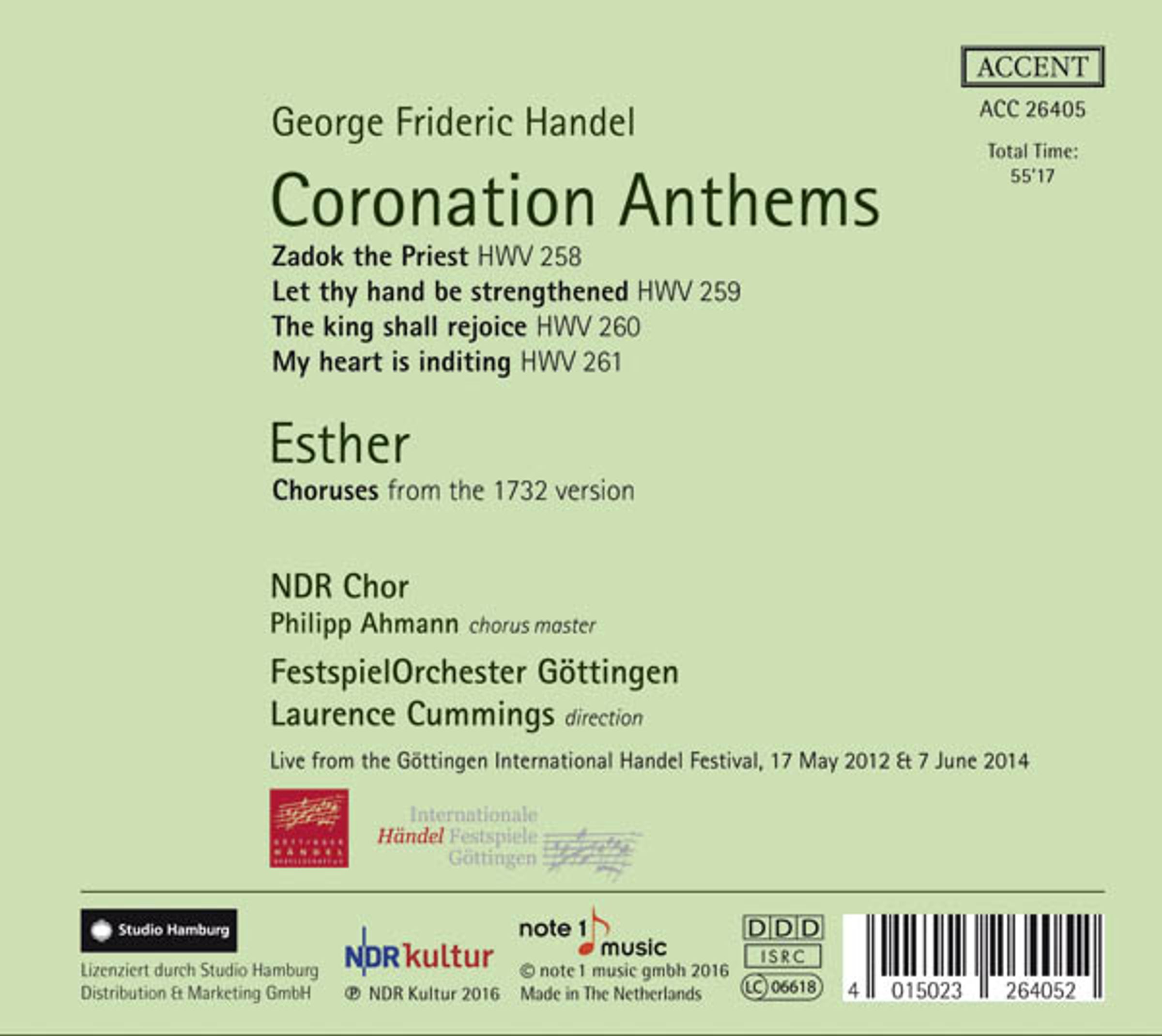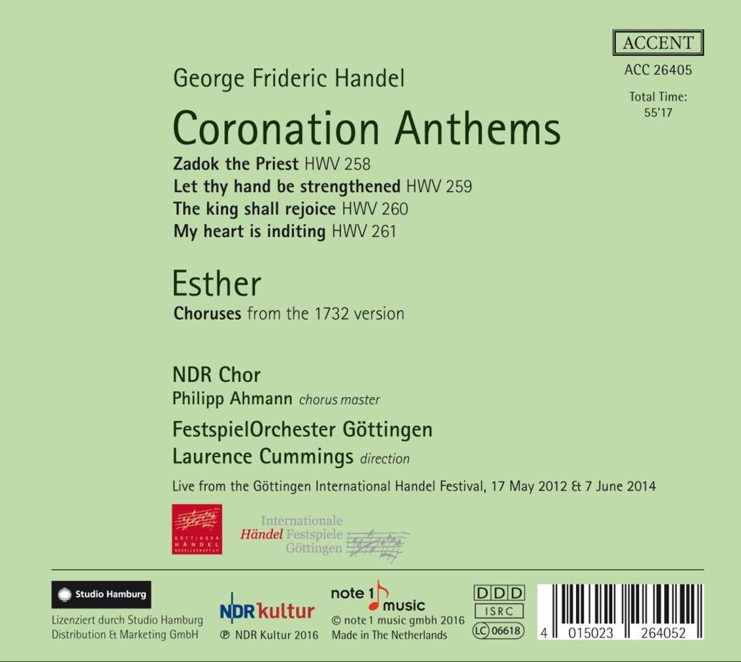 Händels vier Krönungsanthems für Georg II. gehören zu den großartigsten Chorstücken des Barock. Deren Klangpracht umschrieb der englische Musikforscher und Zeitgenosse Charles Burney einst ebenso treffend wie flapsig als „großen Wauwau-Stil“. Neben den vier Anthems erklingen hier auch Chöre aus der 1738er Fassung von Esther - das Werk, mit dem Händel 1718 die Gattung Oratorium in England einführte.