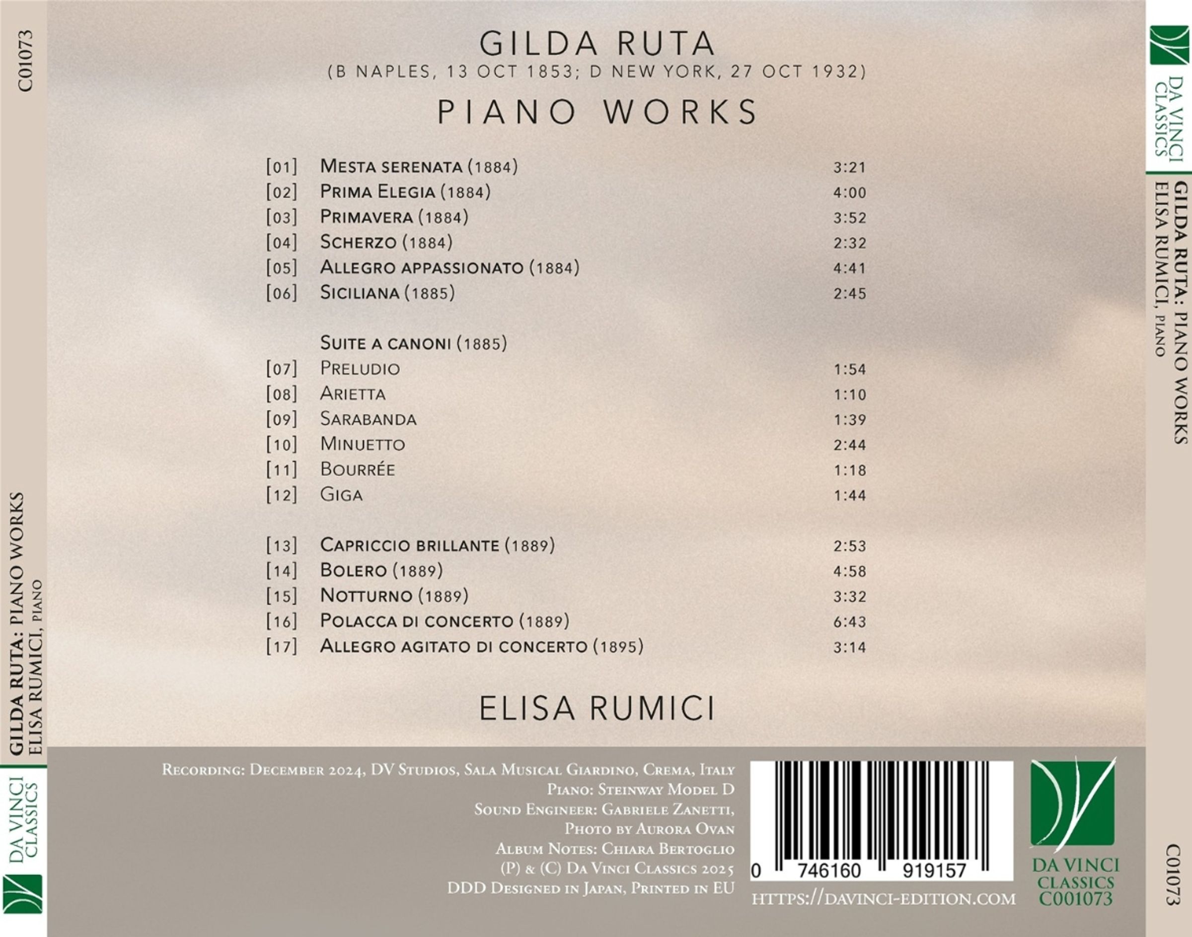 Die Karriere der Pianistin und Komponistin Gilda Ruta fand in zwei Jahrhunderten und auf zwei Kontinenten statt. Sie war zudem Pädagogin und Förderin der Musikkultur. Die Neapolitanerin übersiedelte auf Einladung von Steinway & Sons 1894 in die USA. Nach ihrem Tod im Alter von 79 Jahren 1932 in New York geriet sie leider in Vergessenheit. Ihre Klavierwerke verbinden lyrischen Charme mit technischem Können und zeugen von tiefer Sensibilität und ausgeprägter musikalischer Intelligenz. Von Salonperlen bis zu virtuosen Paradestücken offenbaren sie eine große Bandbreite und Raffinesse