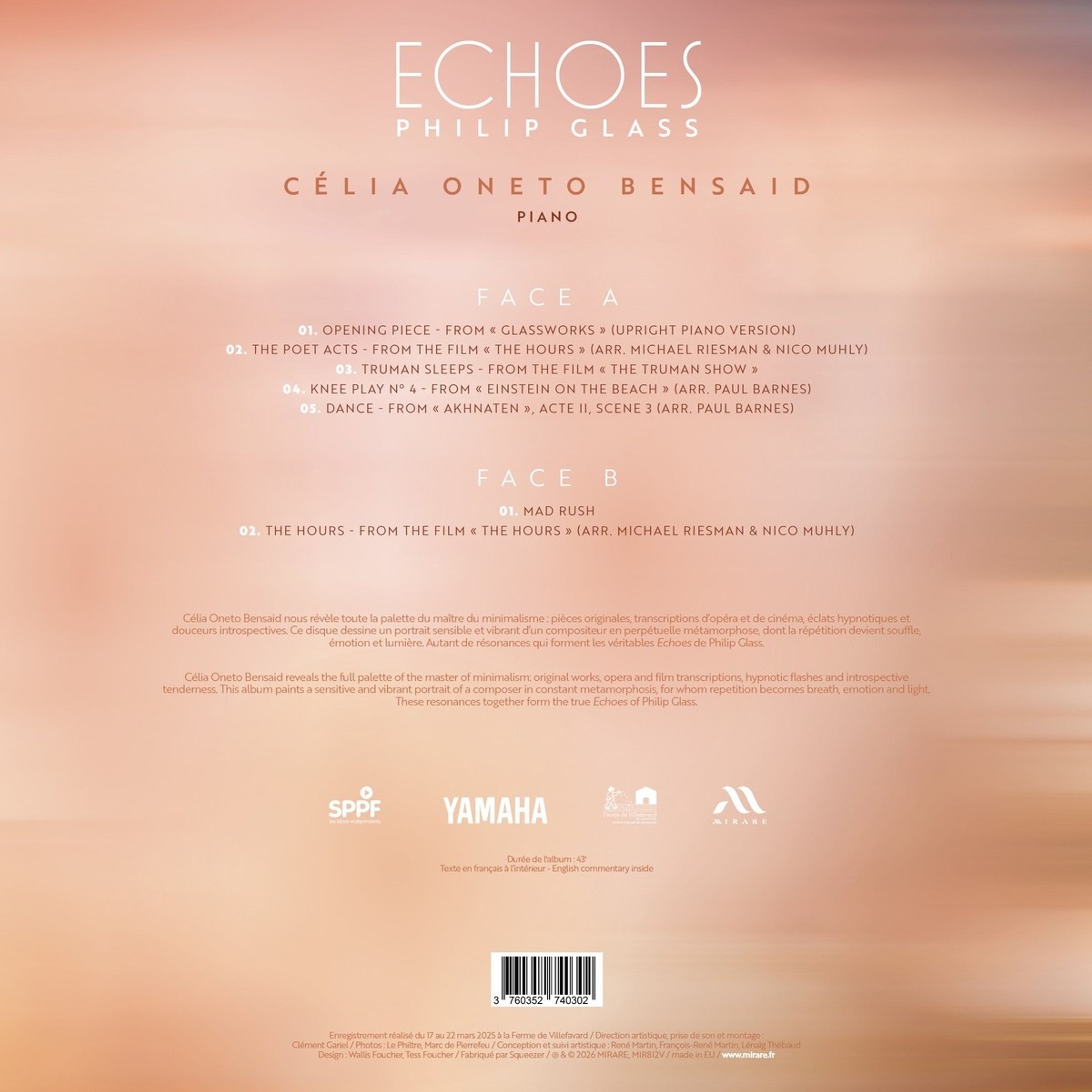 Célia Oneto Bensaid offenbart uns die ganze Bandbreite des Meisters des Minimalismus: Originalkompositionen, Opern- und Filmmusiktranskriptionen, hypnotische Ausbrüche und introspektive Sanftheit. Diese LP zeichnet ein sensibles und lebendiges Porträt eines Komponisten in ständiger Wandlung, dessen Wiederholungen zu Atem, Emotion und Licht werden. All diese Resonanzen bilden die wahren Echoes von Philip Glass