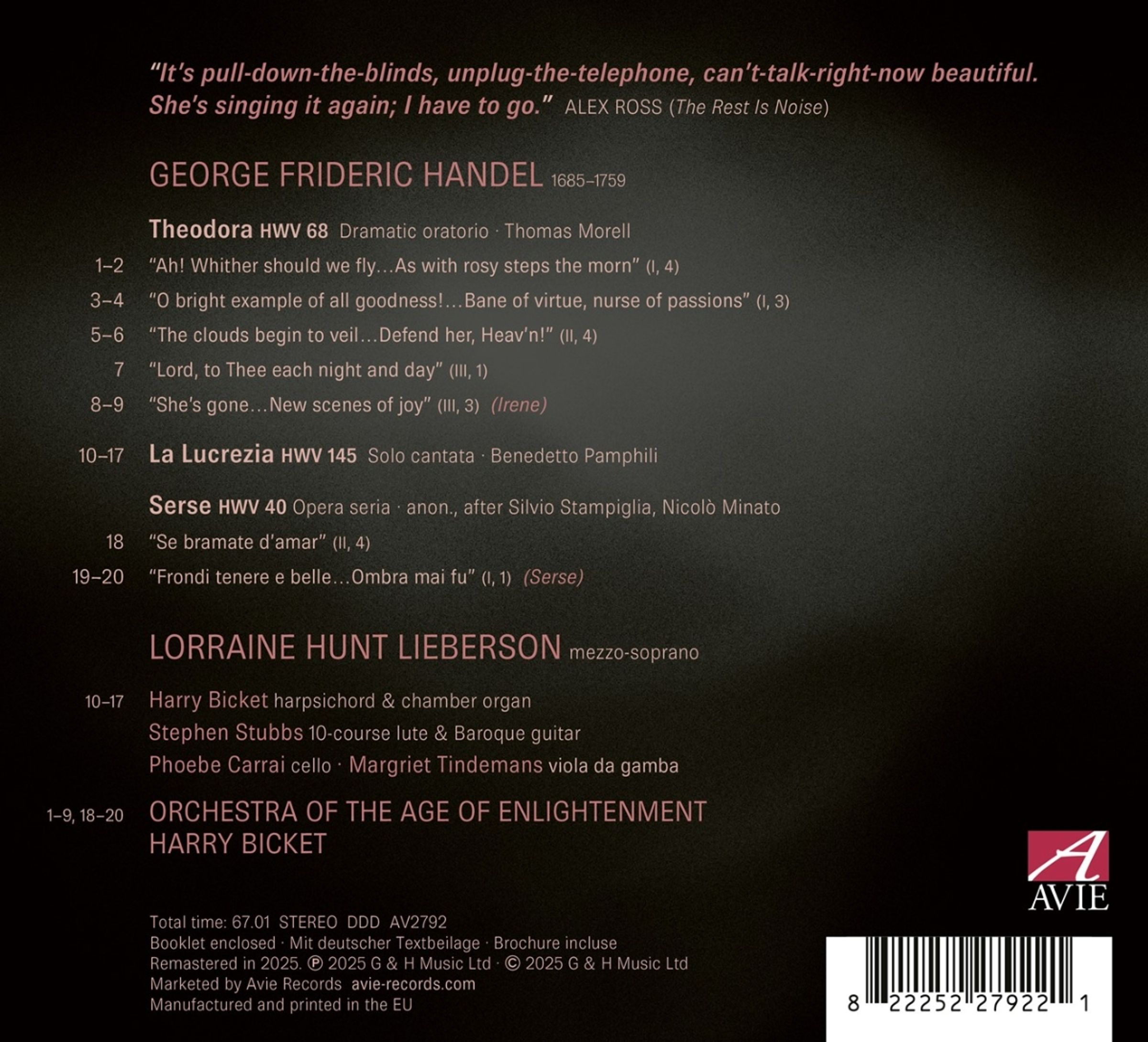 21 Jahre nach der Veröffentlichung von Lorraine Hunt Liebersons legendärer Aufnahme von Händel-Arien mit Harry Bicket und dem Orchestra of the Age of Enlightenment erscheint das Album in einer luxuriösen, digital bearbeiteten Neuauflage. Mit Arien aus dem Oratorium »Theodora« und der Oper »Serse« sowie der Solo-Kantate »Lucrezia« werden lebhafte Erinnerungen an die mitreißende Musikalität der Mezzosopranistin wach. Der Klassik-Kolumnist des New Yorker, Alex Ross, beschrieb das Album seinerzeit als »so schön, dass man die Jalousien herunterlässt, das Telefon aussteckt und vorher noch sagt: Ich kann gerade nicht reden. Sie singt es wieder, ich muss auflegen.«