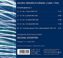 Händels nachfolgende Concerti grossi bieten einen Höhepunkt der Gattung nach dem anderen – und die meisterhafte, transparente Aufführung des Stuttgarter Kammerorchesters unter Michael Hofstetter wird dieser Musik voll und ganz gerecht und die Concerti grossi op. 6 können mit Recht als Höhepunkt in Händels Instrumentalschaffen gelten, auf einer Stufe mit Bachs »Wohltemperiertem Klavier« und seinen »Brandenburgischen« Konzerten.