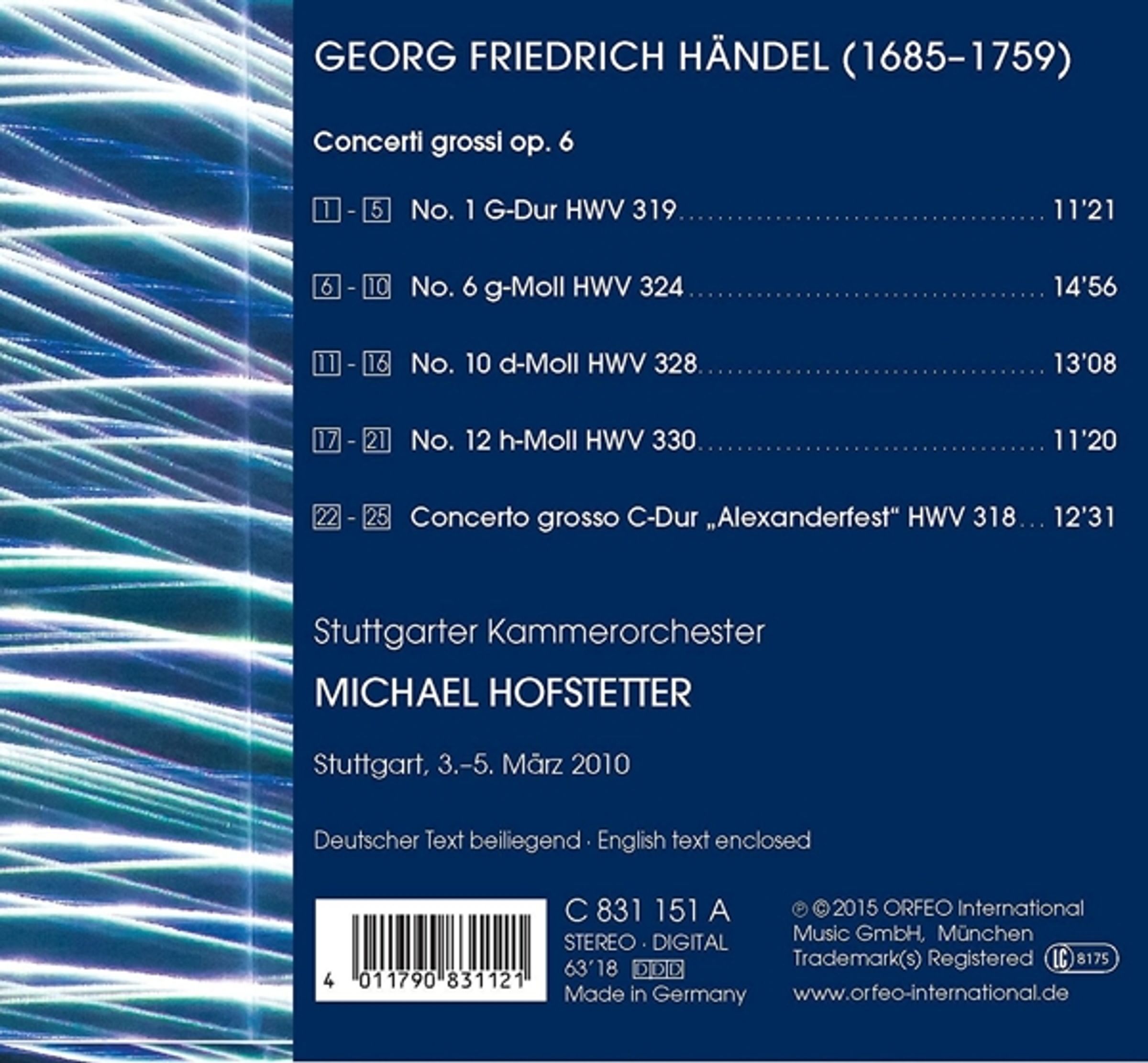 »Händels Concerti grossi op.6, von denen hier eine Auswahl vorgelegt wird, bestätigt aufs Neue die Vertrautheit Hofstetters vor allem mit Barockmusik und zeigt, wie er ›sein‹ Kammerorchester vorwärtsgebracht hat.« (FonoForum, Oktober 2015)Tracklisting