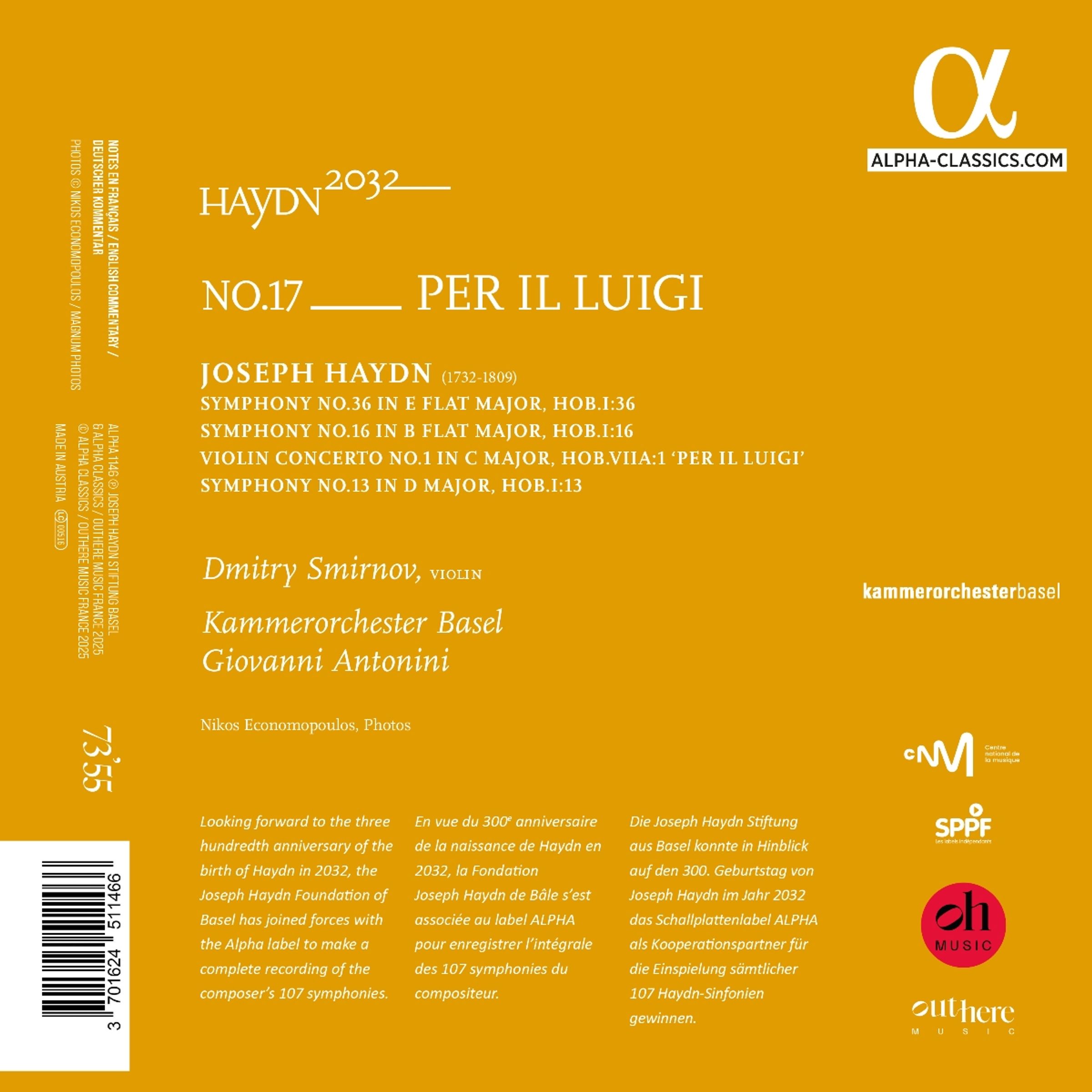 Mit »Per il Luigi«, der 17. Folge der Edition Haydn 2032, erklingen einige von Haydns frühesten Sinfonien, die das Talent derjenigen Musiker unter Beweis stellen sollten, die in derselben Zeit wie Haydn selbst in die Hofkapelle von Esterházy eingetreten waren. Im Mittelpunkt des Programms steht die Sinfonie Nr. 13 in D-Dur aus dem Jahr 1763, die mit vier Hörnern instrumentiert ist und in deren Schlusssatz das berühmte Thema der 25 Jahre später entstandenen »Jupiter«-Sinfonie von Mozart vorweggenommen wird. Das Violinkonzert in C-Dur ist in Haydns Werkverzeichnis als »fatto per il Luigi« bezeichnet und Luigi Tomasini (1741–1808) gewidmet, einem in Pesaro geborenen Geigenvirtuosen und Freund Haydns. Zwei Jahrhunderte später setzt sich der junge Barockgeigenvirtuose Dmitri Smirnov gemeinsam mit dem Kammerorchester Basel unter Giovanni Antonini mit Bravour für dieses Repertoire ein.