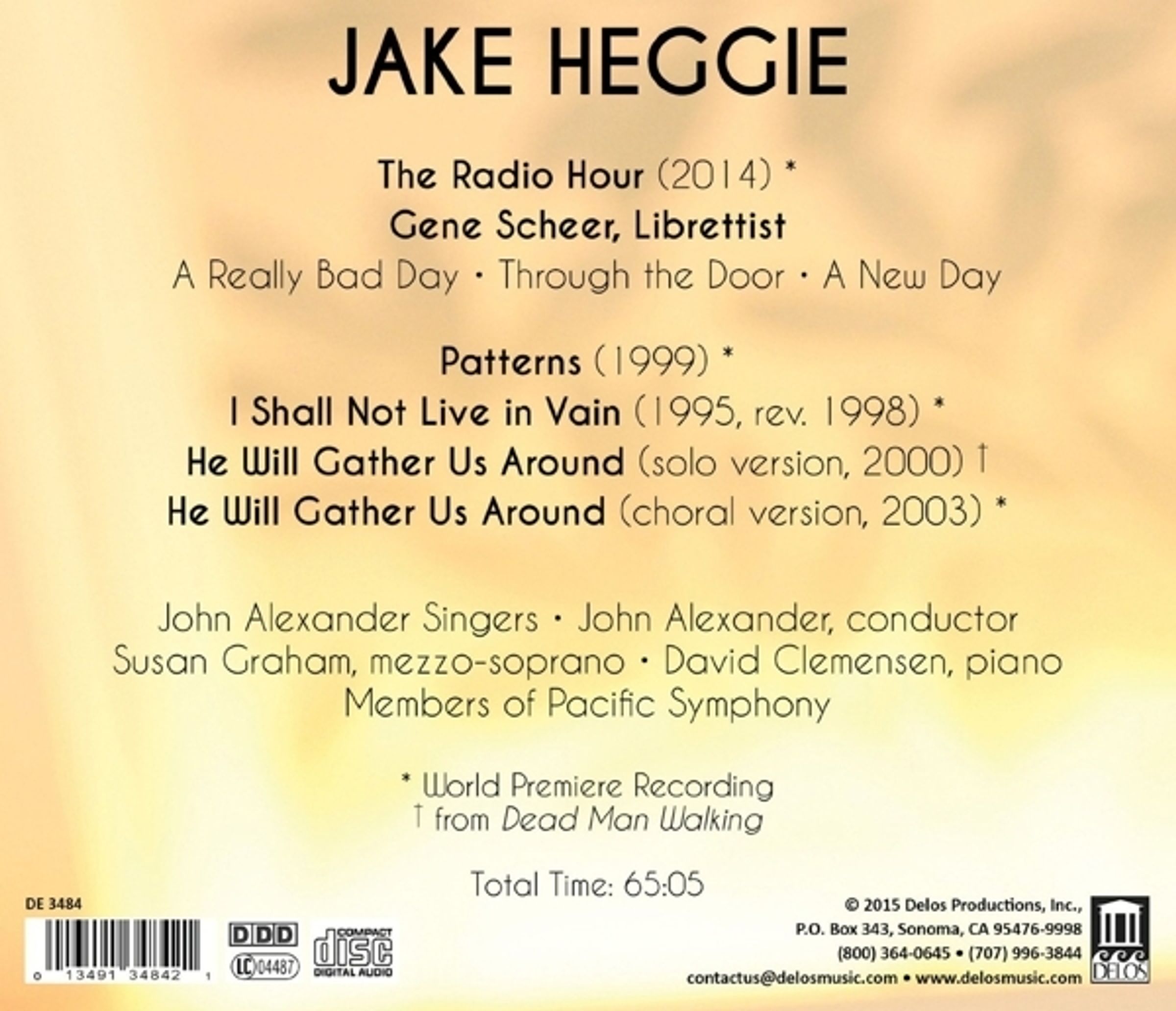 Solche Kommentare (zur Oper Moby Dick) sind ganz typisch für die kritische Reaktion auf Jake Heggies Opernwerke. Ursprünglich als Meisterkomponist von Kunstliedern angesehen, ist er inzwischen als Amerikas vielleicht führender zeitgenössischer Komponist international gefeierter Opern bekannt geworden. Wir werden hier mit überzeugenden Beispielen beider Genres verwöhnt: der Weltpremierenaufnahme einer kurzen Einakter-Oper, The Radio Hour, sowie vier kürzeren Gesangsstücken.