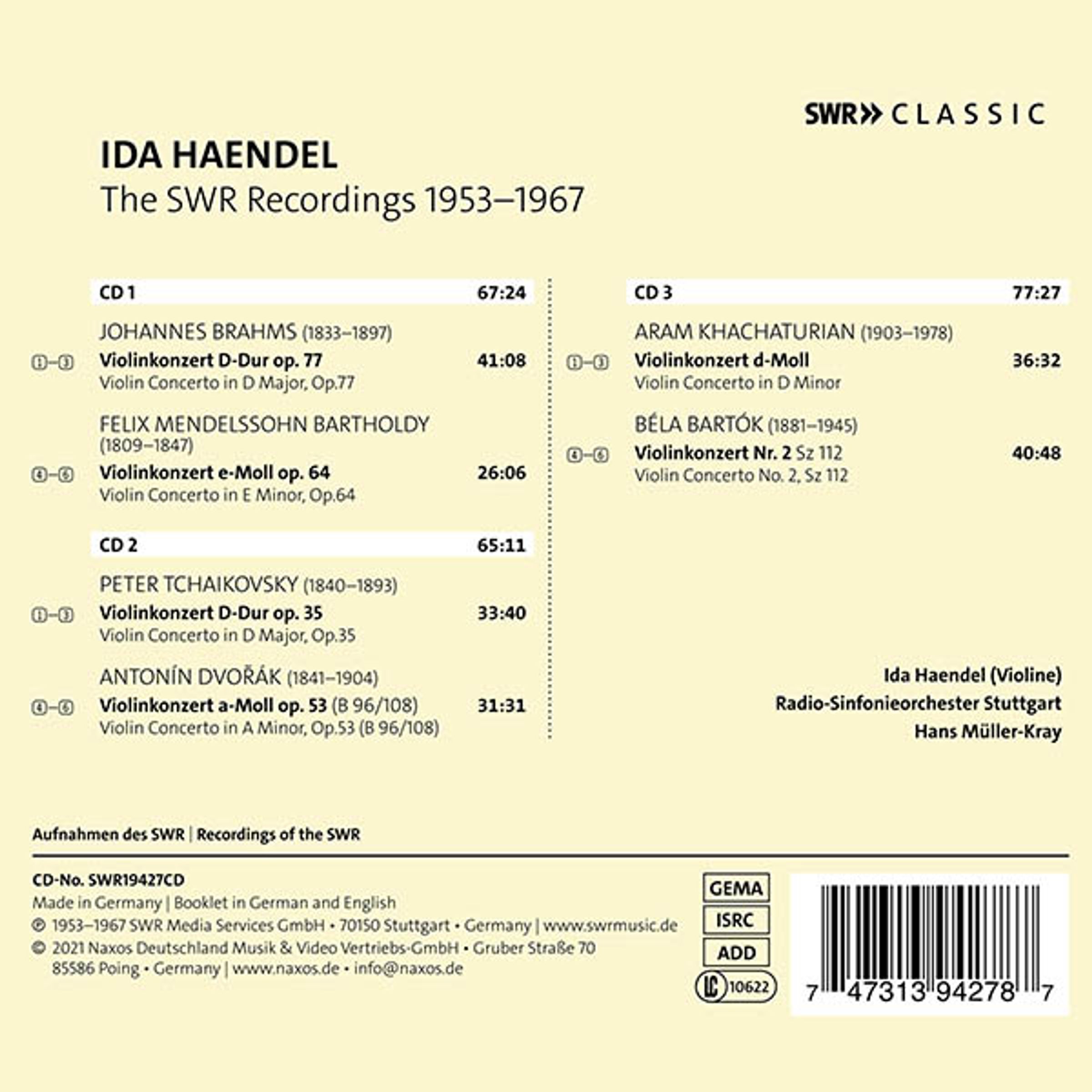 Ida Haendel war ein Phänomen. Die Grande Dame der Geige war bis ins hohe Alter Jurymitglied bei renommierten Wettbewerben und gab Meisterkurse, wobei sie sich ihre geistige Frische und die körperliche Fähigkeit, mit Schwung und Elan auf Tournee zu gehen, stets bewahrte. Keine andere Geigerin hat jemals eine so lange und erfolgreiche Bühnenkarriere erlebt. Auch siebzig Jahre nach ihrem Debüt begeisterte Ida Haendel das Publikum mit ihrer unnachahmlichen Kombination aus leidenschaftlicher Virtuosität und Disziplin. Die Aufnahmen der Konzerte von Mendelssohn, Brahms, Tschaikowsky, Khachaturian, Dvořák und Bartók, die sie vor 1967 unter der Leitung des damaligen SWR-Chefdirigenten Hans Müller-Kray eingespielt hat, gehören heute zu den wertvollsten Schätzen im Archiv des Südwestdeutschen Rundfunks (SDR).