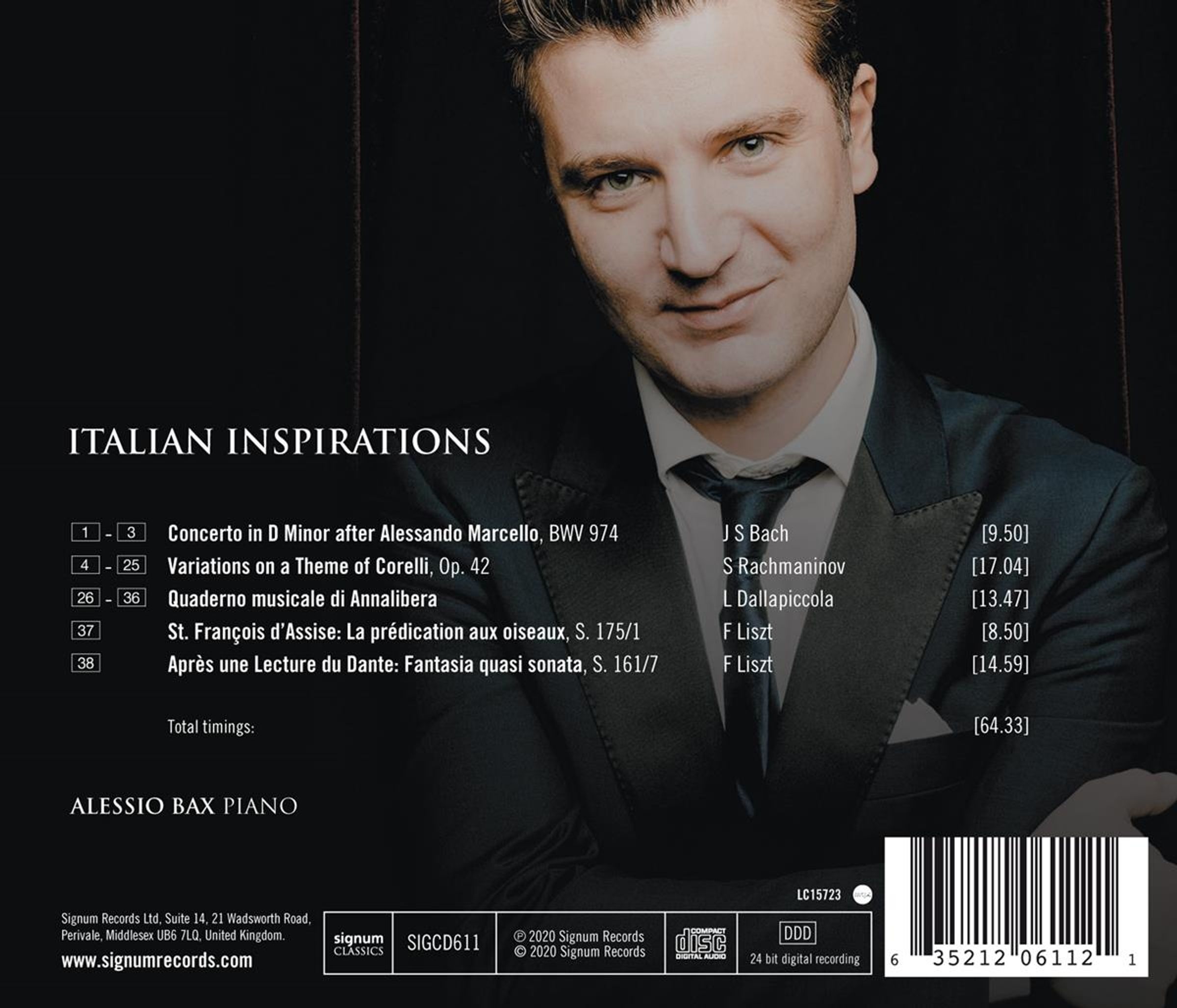 Alessio Bax spielt ein italienisch inspiriertes Programm und wählt seine Lieblingsstücke aus der reichen Musikgeschichte eines der romantischsten Länder der Welt aus.