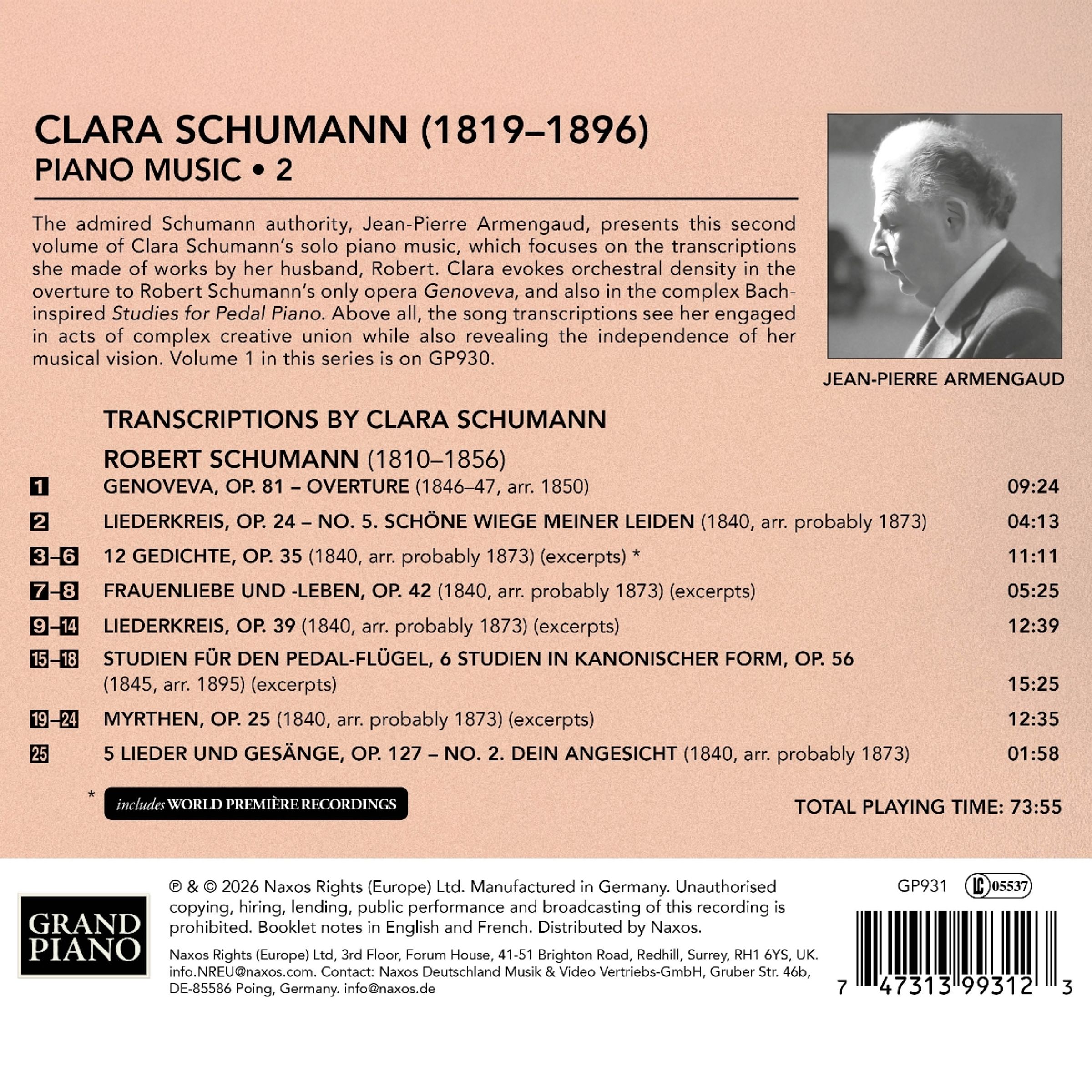 Der angesehene Schumann-Experte Jean-Pierre Armengaud konzentriert sich im zweiten Teil der Reihe von Clara Schumanns Klaviermusik auf ihre Transkriptionen der Werke ihres Mannes Robert. Clara beschwört orchestrale Dichte herauf, sowohl in der Ouvertüre zu Robert Schumanns einziger Oper "Genoveva" als auch in den komplexen, von Bach inspirierten "Etüden für Pedalklavier". Vor allem in den Liedtranskriptionen zeigt sich ihr komplexes kreatives Schaffen, das gleichzeitig die Unabhängigkeit ihrer musikalischen Vision offenbart. Jean-Pierre Armengaud gilt als führender Interpret französischer Musik und Spezialist für impressionistisches und expressionistisches Repertoire und ist bekannt für sein 'flüssiges, geschmeidiges Spiel und seinen runden, weichen Ton' (Classica). Er hat unter anderem Gesamtaufnahmen mit Klavierwerken von Claude Debussy, Eric Satie, Albert Roussel, Francis Poulenc, Henri Dutilleux und Edison Denisov eingespielt. Armengaud ist in den wichtigsten Konzertsälen der Welt aufgetreten und hat in über 40 Landern konzertiert. Er war Leiter der Musikprogrammgestaltung bei Radio France und ist außerordentlicher Professor an der Universität Paris-Sorbonne sowie emeritierter Professor an der Universität Evry Val d'Essonne der Universitat Paris-Saclay. Bei den Aufnahmen der vier Gedichte aus der Sammlung "12 Gedichte", op. 35 handelt es sich um Weltersteinspielungen.