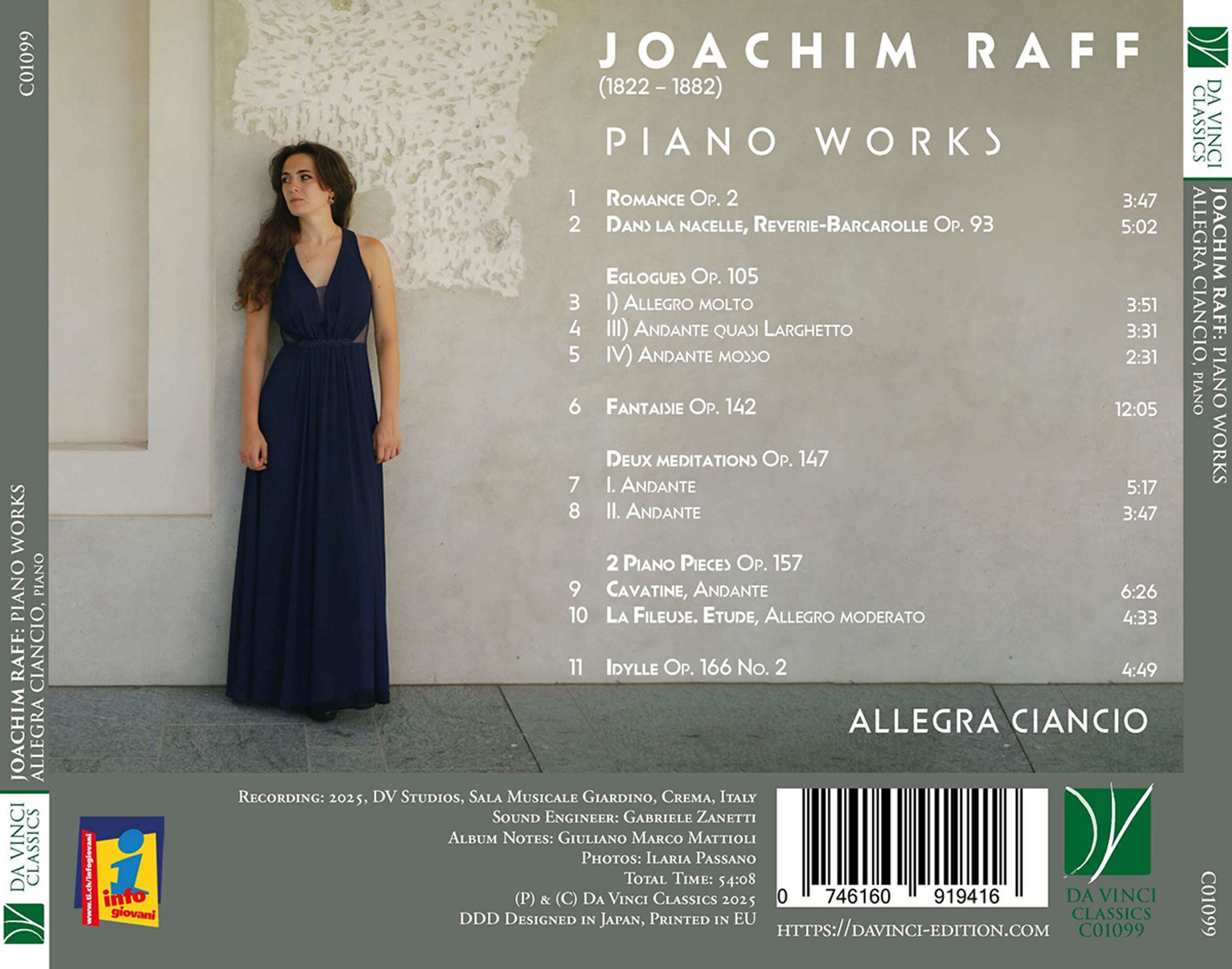 Der Schweizer Joachim Raff, der den größten Teil seines Lebens in Deutschland verbrachte, war als Komponist größtenteils Autodidakt, hatte aber prominente Fürsprecher wie Mendelssohn, Liszt und Bülow. Sein später Erfolg verblasste im 20. Jahrhundert wieder. Erst 100 Jahre nach seinem Tod wurde sein Werk wiederentdeckt, vor allem die Sinfonik. Die Tessiner Pianistin Allegra Ciancio widmet nun ein Album ganz dem Klavierwerk Raffs und verschafft dem Hörer einen Überblick von der frühen Romanze op. 2 bis zum späten Idyll op. 166.
