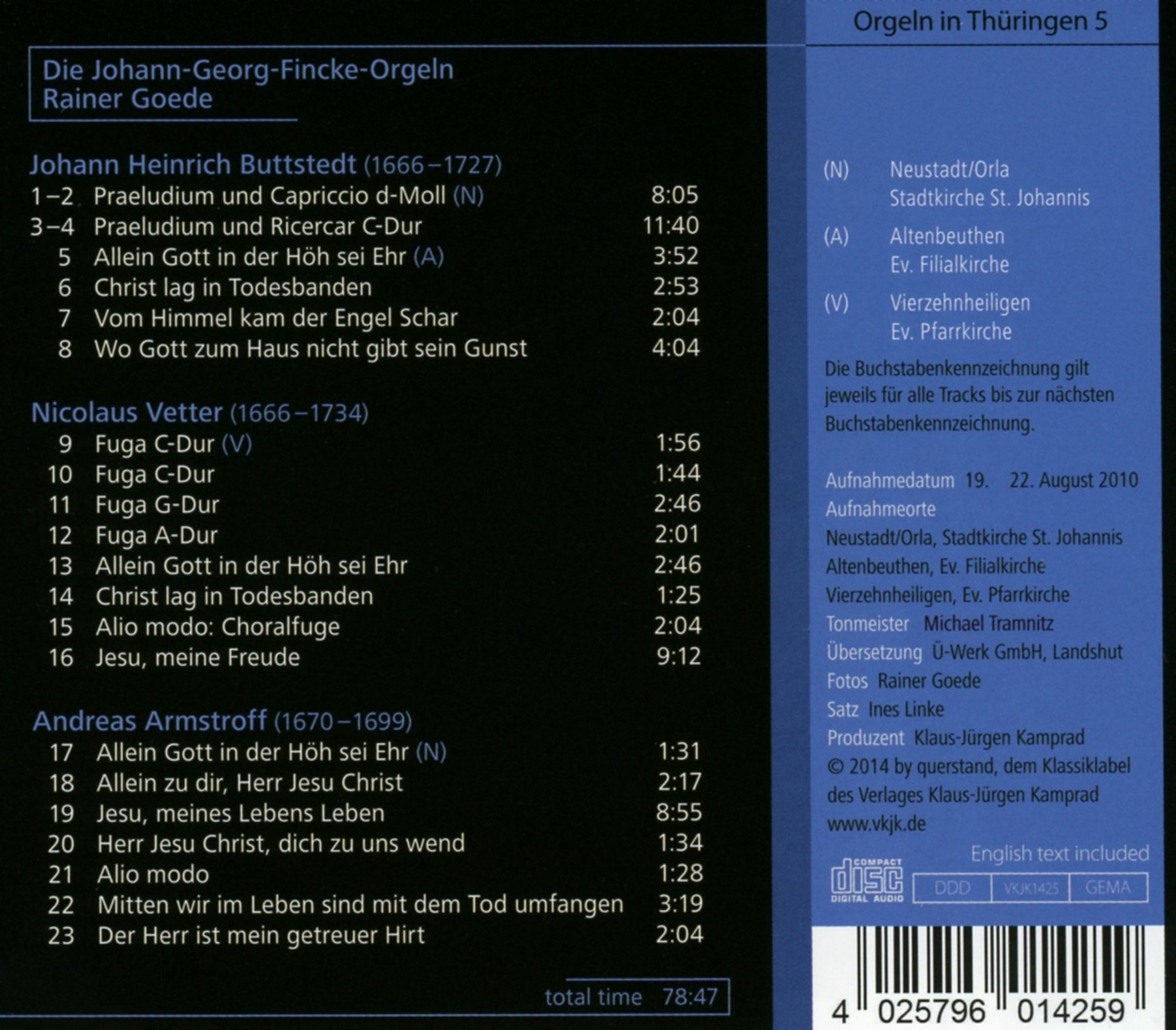 Für die Einspielung, die im Rahmen der erfolgreichen querstand-CD-Serie »Orgeln in Thüringen« erscheint, wählte der Organist Werke, die in sowohl zeitlicher als auch technisch-ästhetischer Hinsicht in enger Beziehung zu den jeweiligen Orgeln stehen und erschließt so dem Repertoire Musik der heute weitgehend vergessenen thüringischen, eine Generation vor Bach wirkenden Komponisten Andreas Armstroff, Johann Heinrich Buttstedt und Nicolaus Vetter.