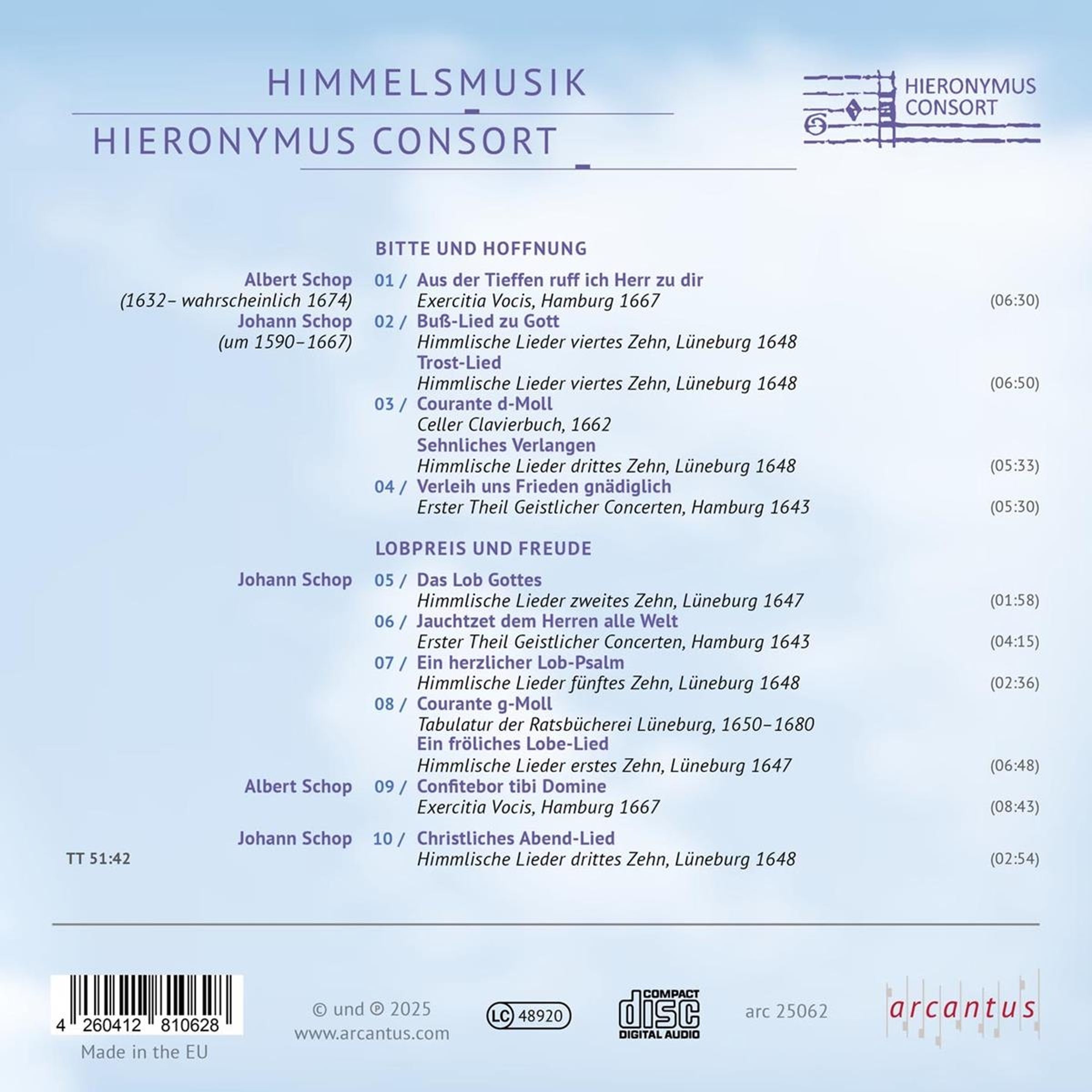 Auf seiner Debüt-CD Himmelsmusik erkundet das Hieronymus Consort geistliche Konzerte und Lieder des Hamburger Ratsmusikers und Organisten Johann Schop sowie seines Sohnes Albert Schop. Beide Komponisten waren in ihrer Zeit gut vernetzt: Johann reiste zusammen mit Heinrich Schütz nach Kopenhagen, um dort bei den Hochzeitsfeierlichkeiten des dänischen Kronprinzen zu musizieren. Albert bekam seine Orgelausbildung bei Philipp Scheidemann und wirkte als Organist am mecklenburgischen Hof in Güstrow. Die Konzerte glänzen durch Textorientierung und Virtuosität, die Lieder entführen den Hörer mit den Texten aus Johann Rists Himmlischen Liedern in andere Welten.