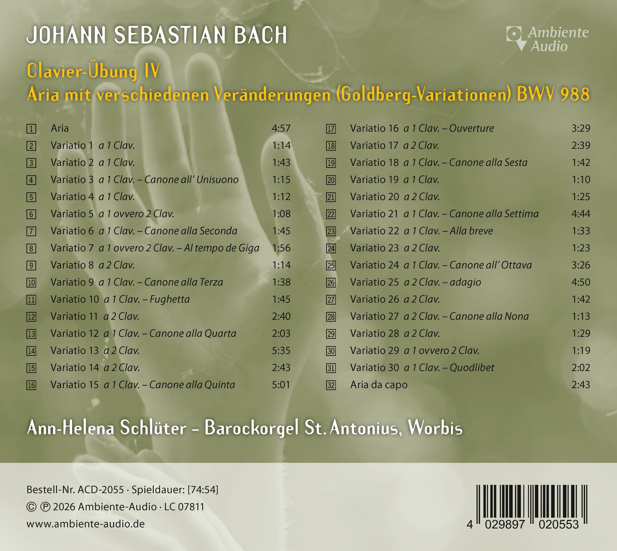 Die Barockorgel der Wallfahrtskirche St. Antonius in Worbis bietet mit ihren 35 Registern und 3 Manualen eine außerordentlich vielfältige Klangpalette, die Ann-Helena Schlüter in den Goldberg-Variationen überzeugend einzusetzen vermag. Das Instrument wurde ursprünglich 1697 von dem Franziskaner Adam Oehninger erbaut und konnte – nach tiefgreifenden Umbauten zu Beginn des 20. Jahrhunderts – vor einigen Jahren in der Originalgestalt rekonstruiert werden. Für einen besonderen klanglichen Reiz sorgen zusätzlich die mitteltönige Stimmung und die lebendige, atmende Windversorgung: die Orgel hat kein elektrisches Gebläse, denn die 6 Keilbälge werden durch einen elektromechanischen Balgaufzug so betätigt, wie es ein Calcant tun würde.