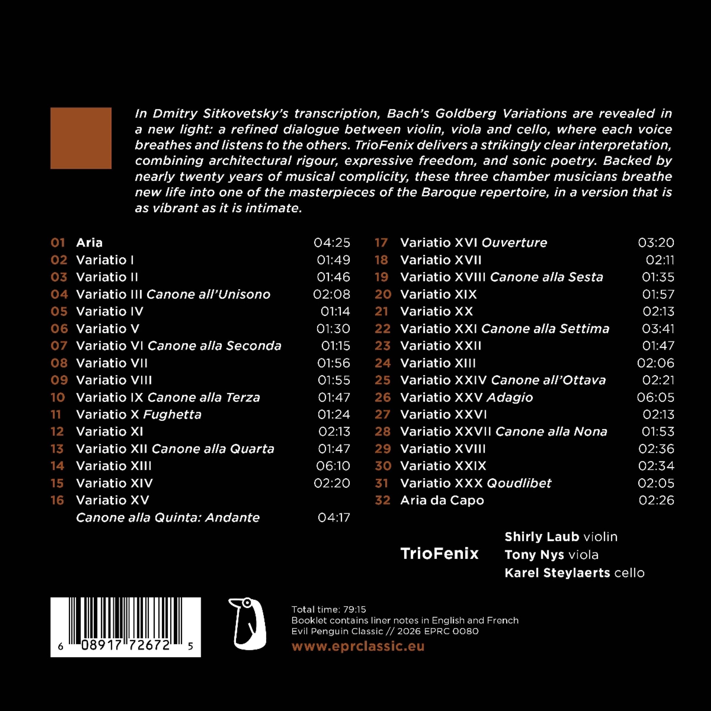 In Dmitry Sitkovetskys Transkription erscheinen Bachs Goldberg-Variationen in einem neuen Licht: als raffinierter Dialog zwischen Violine, Viola und Cello, in dem jede Stimme atmet und den anderen zuhört. TrioFenix liefert eine beeindruckend klare Interpretation, die architektonische Strenge, expressive Freiheit und klangliche Poesie vereint. Gestützt auf fast zwanzig Jahre musikalischer Verbundenheit hauchen diese drei Kammermusiker einem der Meisterwerke des Barockrepertoires neues Leben ein, in einer ebenso lebendigen wie intimen Fassung.