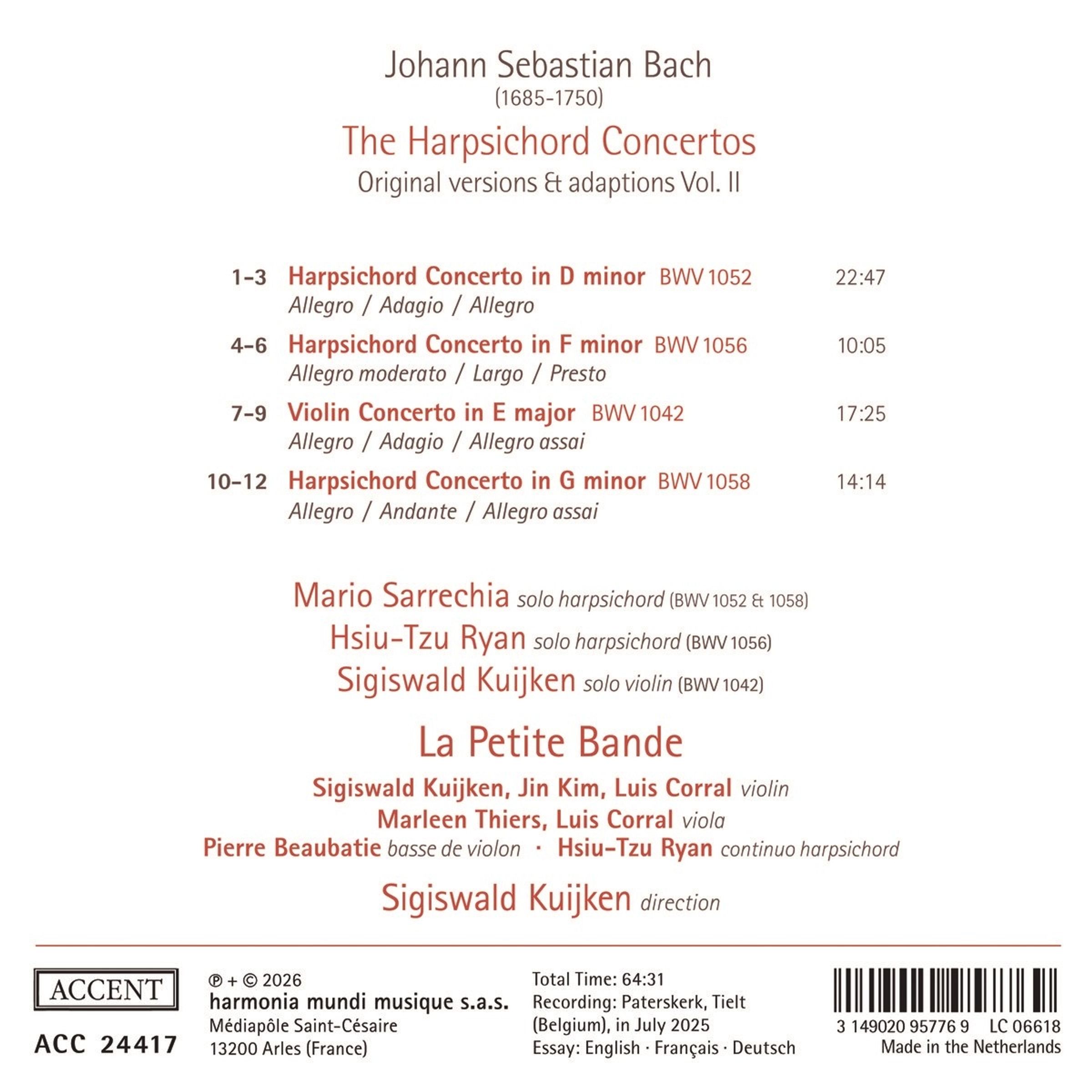 Der „Grandseigneur der Alten Musik“ Sigiswald Kuijken kombiniert Bachs sechs Cembalokonzerte und die drei Doppelkonzerte für zwei Cembali mit den beiden Violinkonzerten sowie dem Doppelkonzert für zwei Violinen, die von Bach eben auch als Cembalokonzerte bearbeitet wurden. Alle zwölf Konzerte erscheinen in einer Serie von drei CDs, von denen hier nun die zweite Folge vorliegt. Solisten sind der belgische Cembalist Mario Sarrechia, die taiwanesische Cembalistin Hsiu-Tzu Ryan sowie Sigiswald Kuijken selbst im Violinkonzert BWV 1042. Wie es wohl auch zu Bachs Zeit praktiziert wurde, sind alle Orchesterstimmen des Ensembles La Petite Bande solistisch besetzt.