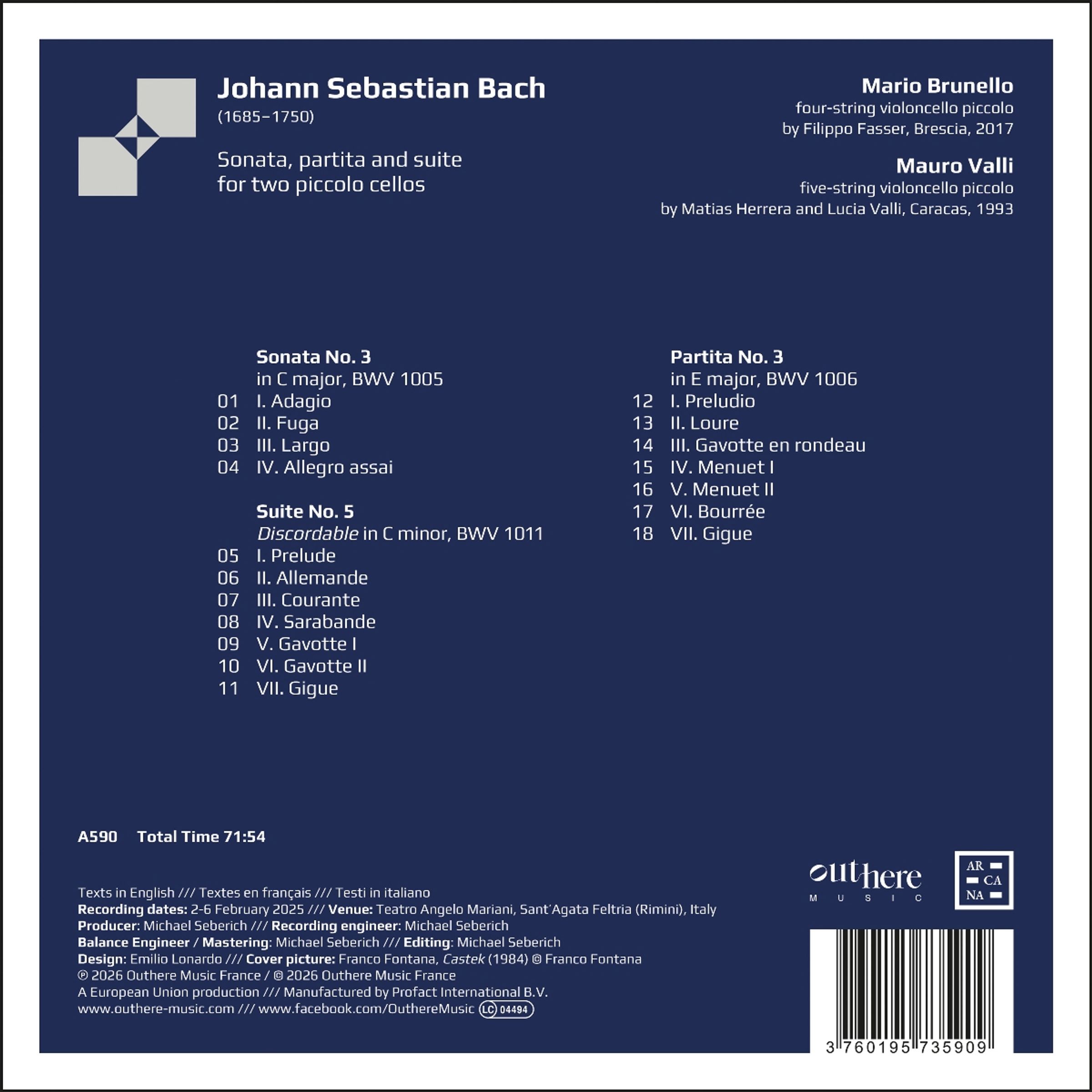 Zwei Violoncelli piccoli, eines mit vier, das andere mit fünf Saiten, insgesamt also neun Saiten: Es ist, als wäre ein neues Instrument geboren worden, eine Orgel mit Saiten statt Pfeifen, um virtuose polyphone Meisterwerke mit einer größeren, bereicherten Klangpalette aufzuführen. Ausgehend von Gustav Leonhardts Klavier-Transkriptionen der Suiten, Sonaten und Partiten verleiht Mario Brunello drei von Bachs Solostücken für unbegleitete Violine und Violoncello eine neue klangliche Dimension und macht die zuvor auf nur vier Saiten beschränkte Polyphonie hörbar. Sein langjähriger Freund Mauro Valli, der bereits bei Arcana mit seiner persönlichen Neuinterpretation der Cellosuiten (Bach in Bologna A459, 2019) zu hören war, steht ihm dabei zur Seite.