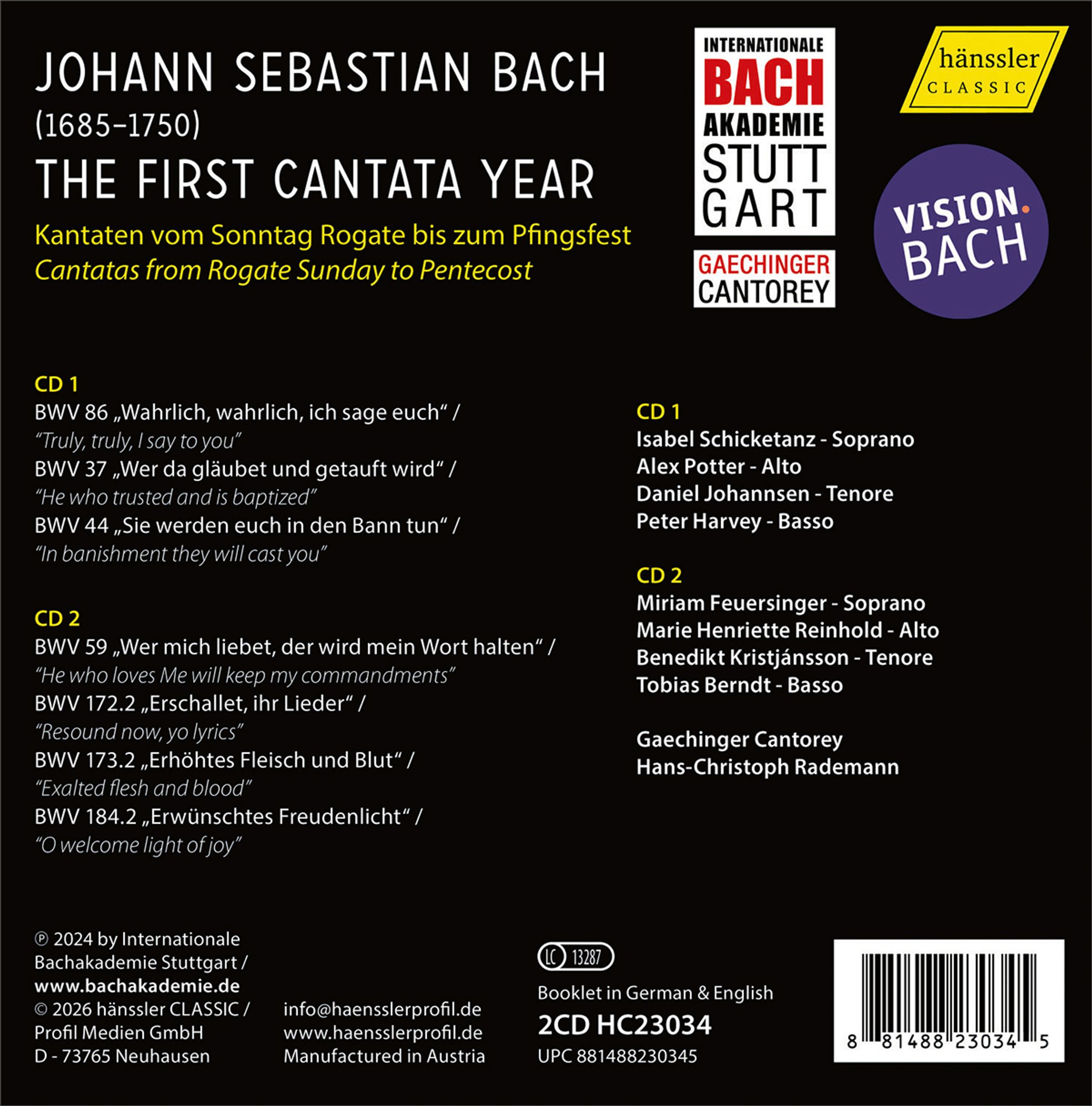 - Isabel Schicketanz, Miriam Feuersinger, Alex Potter, Daniel Johannsen, Peter Harvey, Marie Henriette Reinhold, Benedikt Kristjansson, Tobias Berndt, Gaechinger Cantorey, Hans-Christoph Rademann