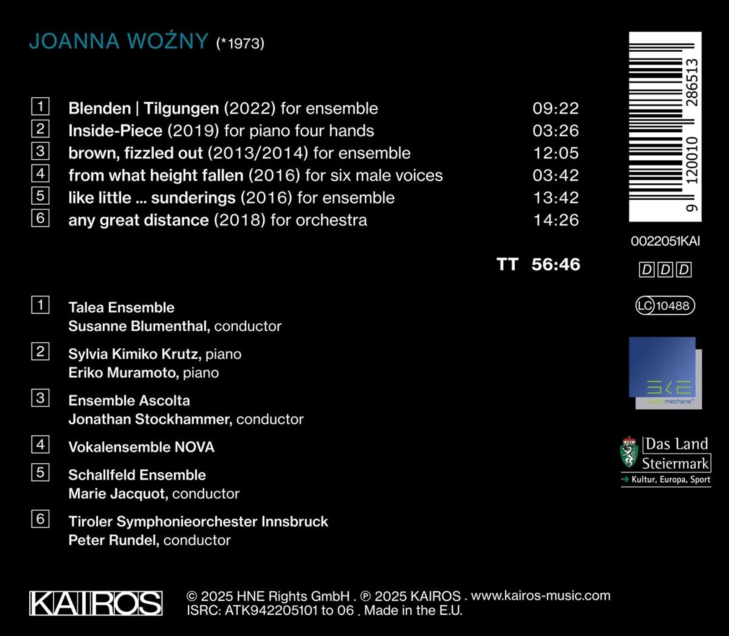 Blenden / Tilgungen für Ensemble; Inside-Piece für Klavier 4-händig; brown, fizzled out für Ensemble; from what height fallen für 6 Männerstimmen; like little ... sunderings für Ensemble; any great distance für Orchester