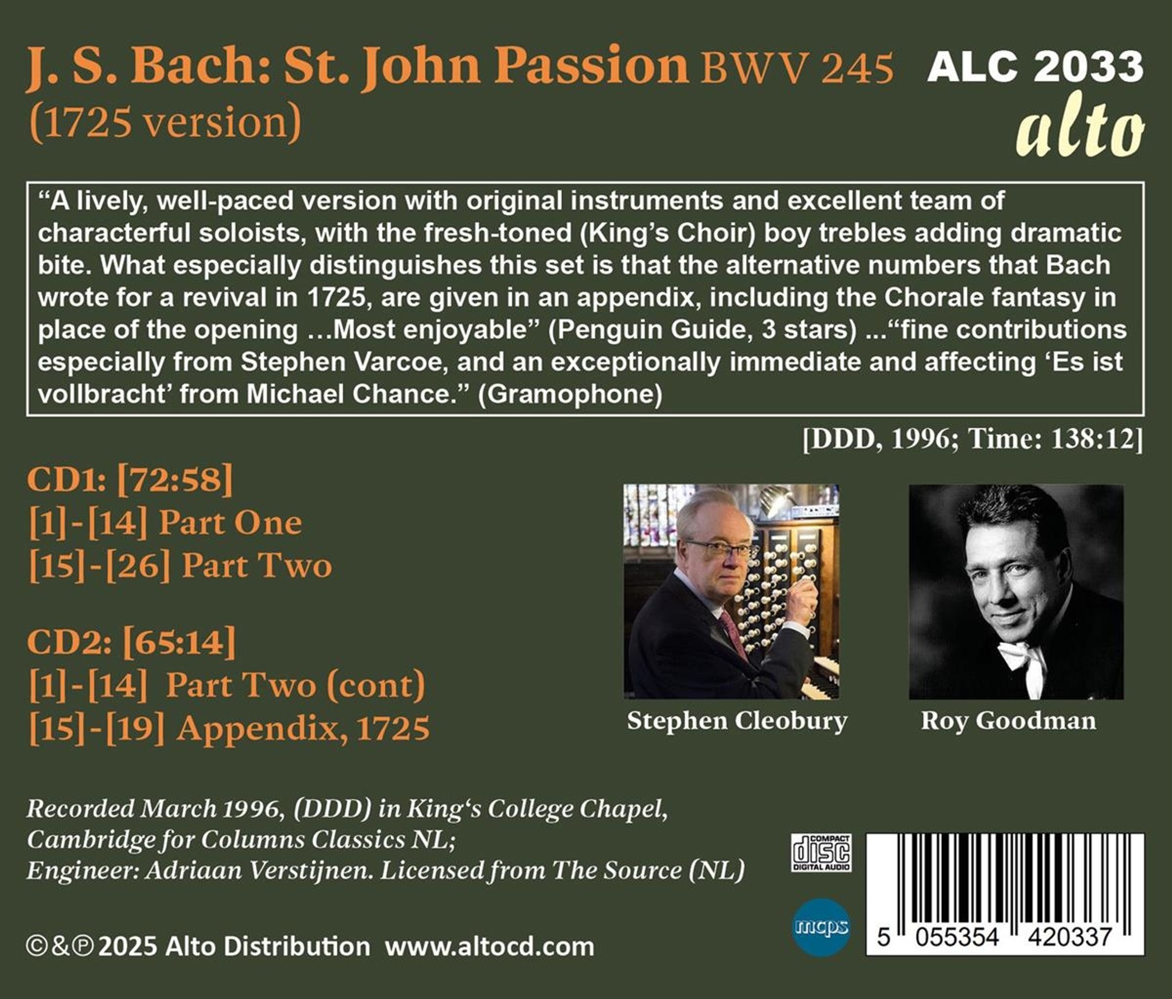 Alto veröffentlicht erneut die gefeierten Aufnahme der Johannespassion Bachs aus dem Jahr 1996, eingespielt vom King's College Choir Cambridge unter der Leitung von Stephen Cleobury, begleitet von einer beeindruckenden Reihe von Barockspezialisten unter der Leitung des Tenors John Mark Ainsley (Evangelist), dem Bass Stephen Richardson als Christus, der Sopranistin Catherine Bott, dem Alt Michael Chance und dem Bariton Stephen Vance. Das Orchester, das Brandenburg Consort, gegründet von Roy Goodman, war eines der führenden Ensembles für historische Instrumente, das sich auf die Musik von J. S. Bach und seinen Zeitgenossen spezialisiert hatte. Die Johannespassion wurde erstmals 1724 im Rahmen eines Gottesdienstes während der Karwoche in der Thomaskirche in Leipzig aufgeführt, wobei im folgenden Jahr weitere Stücke hinzugefügt wurden, die in dieser Aufnahme enthalten sind („1725er Fassung“), obwohl Bach später zur ursprünglichen Fassung von 1724 zurückkehrte. Mit ihren Gerichtsszenen ist die Johannespassion deutlich dramatischer als die Matthäuspassion, die einige Jahre später folgte.