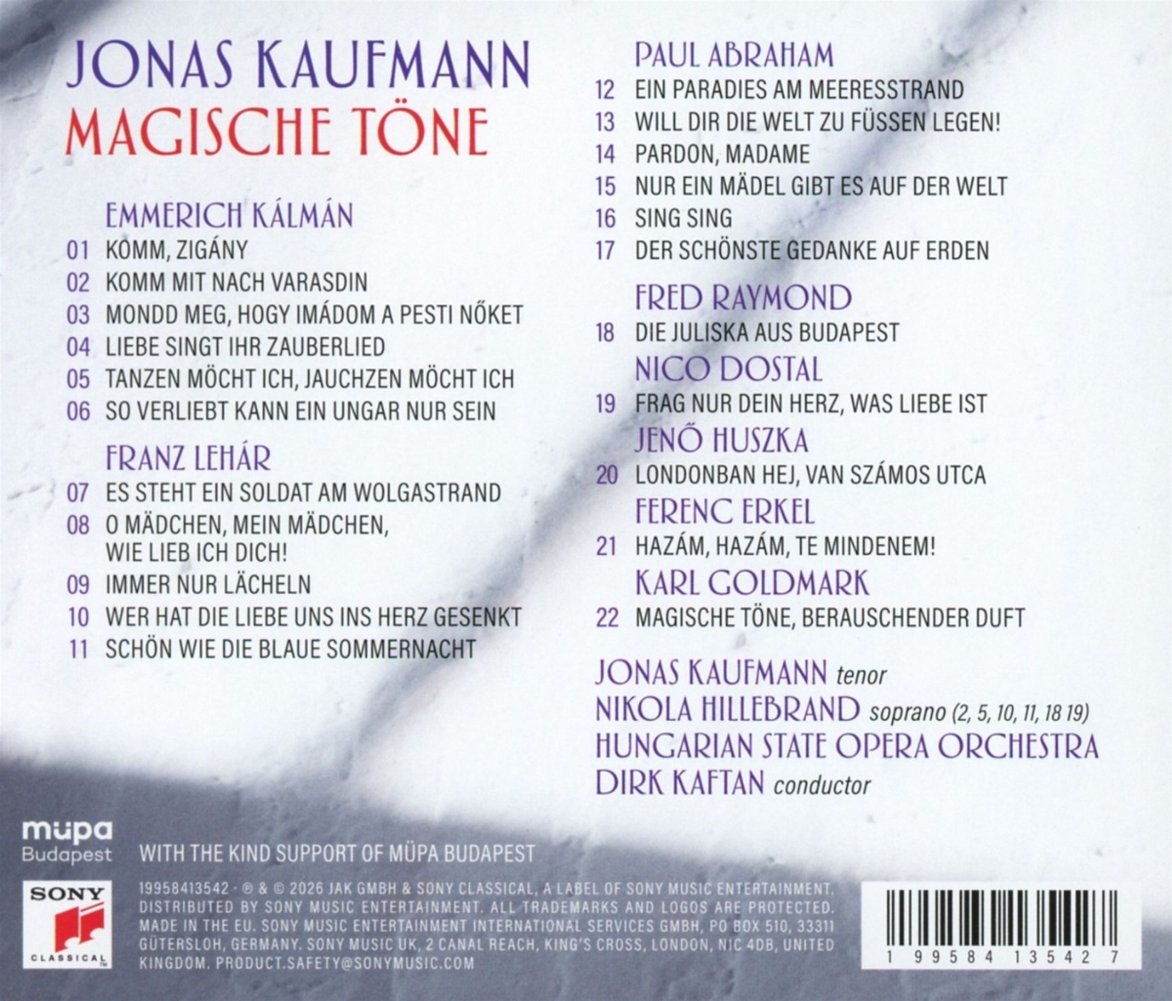 Zwei Operntitel runden das neue Album ab: die Arie Hazám, hazám (»Mein Heimatland«) aus der Oper Bánk bán von Ferenc Erkel – ein leidenschaftliches Bekenntnis zur ungarischen Heimat – und »Magische Töne«, die berühmte Arie aus Karl (Károly) Goldmarks Die Königin von Saba. Magisch werden diese Töne, wenn der Sänger es versteht, seiner Stimme in exponierter Lage die zarten, innigen Pianoklänge abzugewinnen – was für Jonas Kaufmann besonders reizvoll ist: »Jemand hat mir mal gesagt: Deine lauten Töne sind mitreißend, aber deine leisen machen mich verrückt. Wahrscheinlich wirken dramatische Töne beim Hörer eher auf Körper und Nervensystem, die leisen auf Herz und Seele.«