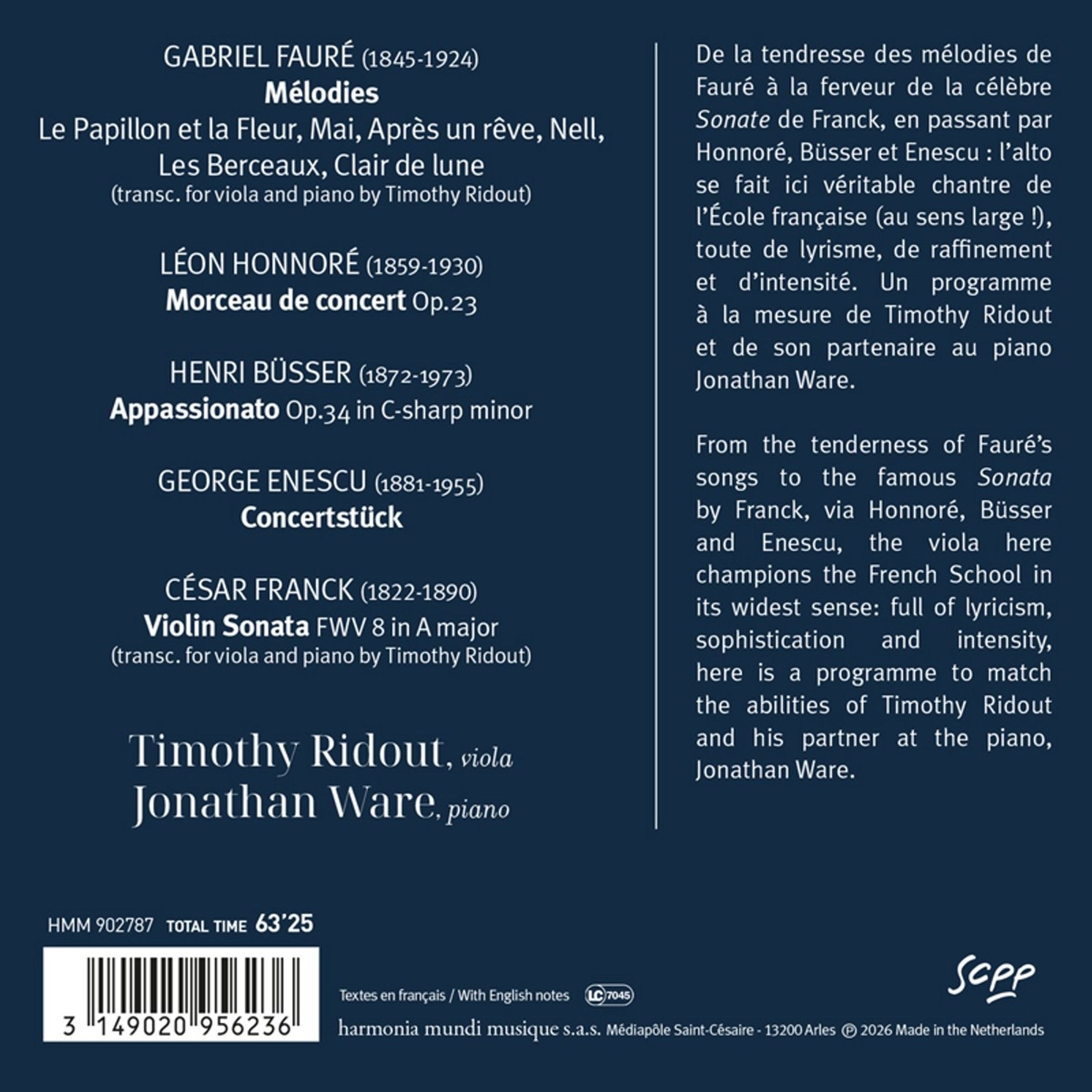 Von der Innigkeit der Lieder Faurés bis zum Feuer der berühmten Sonate von Franck über Honnoré, Büsser und Enescu: Hier singt (im übertragenen Sinn!) die Bratsche das Loblied auf die von Lyrismus, Feinsinn und Ausdruckskraft geprägte französische Schule. Ein Programm wie gemacht für Timothy Ridout und Jonathan Ware, seinen Partner am Flügel.