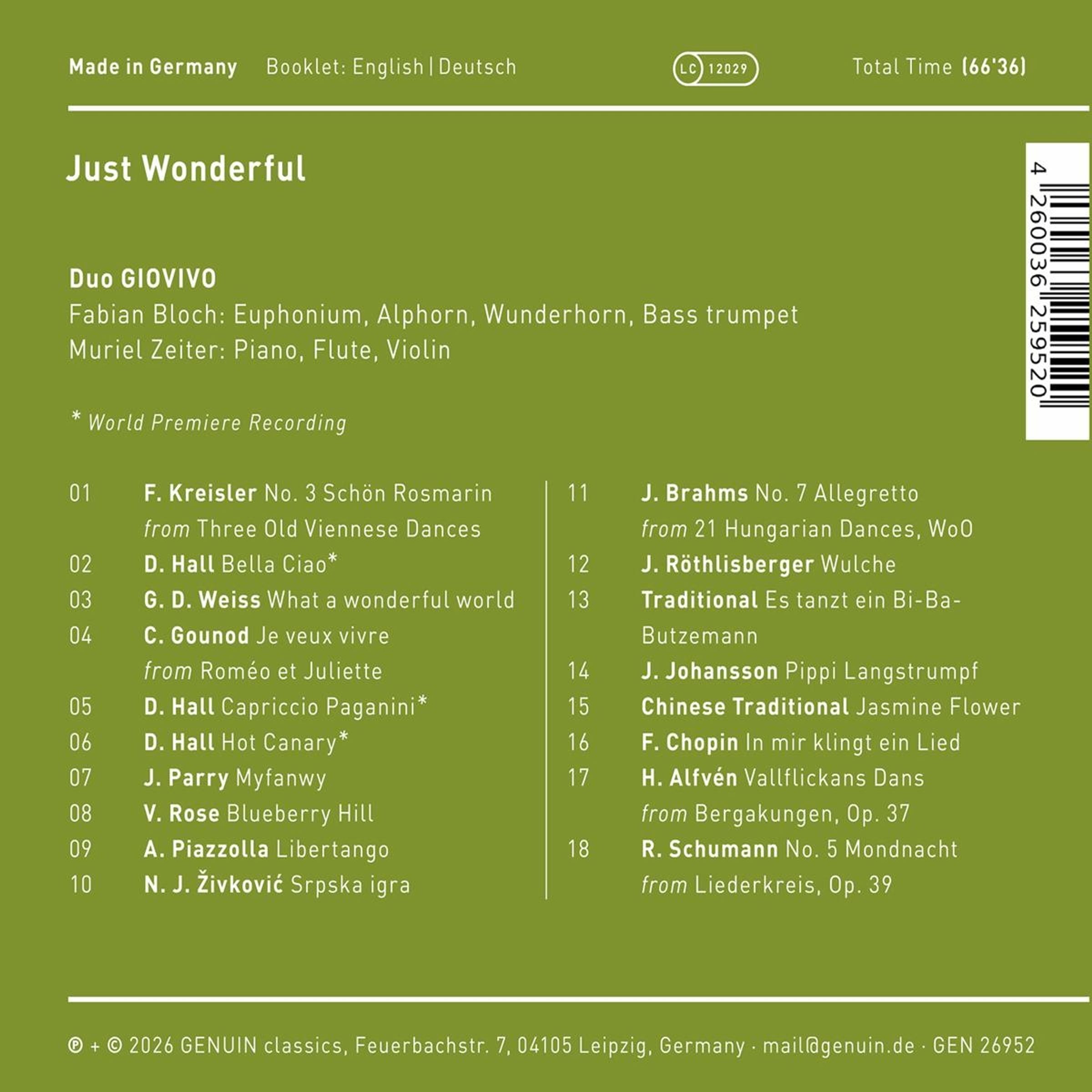 Mit Just Wonderful legt das Duo GIOVIVO sein viertes GENUIN-Album vor und begeistert mit Esprit und beeindruckender Vielseitigkeit. Die Multiinstrumentalisten Fabian Bloch und Muriel Zeiter verbinden schwungvolle Tänze, swingende Hits, bekannte Opernmelodien und neu interpretierte Kinderklassiker. Mit insgesamt sieben Instrumenten entsteht eine außergewöhnliche Klangpalette: Fabian Bloch wechselt mühelos zwischen Euphonium, Alphorn, Basstrompete und Wunderhorn, während Muriel Zeiter mit Klavier, Violine und Flöte glänzt. Ob im schwedischen Vallflickans Dans oder im jazzigen What a wonderful world - jedes Stück erhält eine ganz eigene, persönliche Note. Ein lebendig gestaltetes Album, das gute Laune versprüht: frisch, leidenschaftlich, virtuos und einfach wundervoll.
