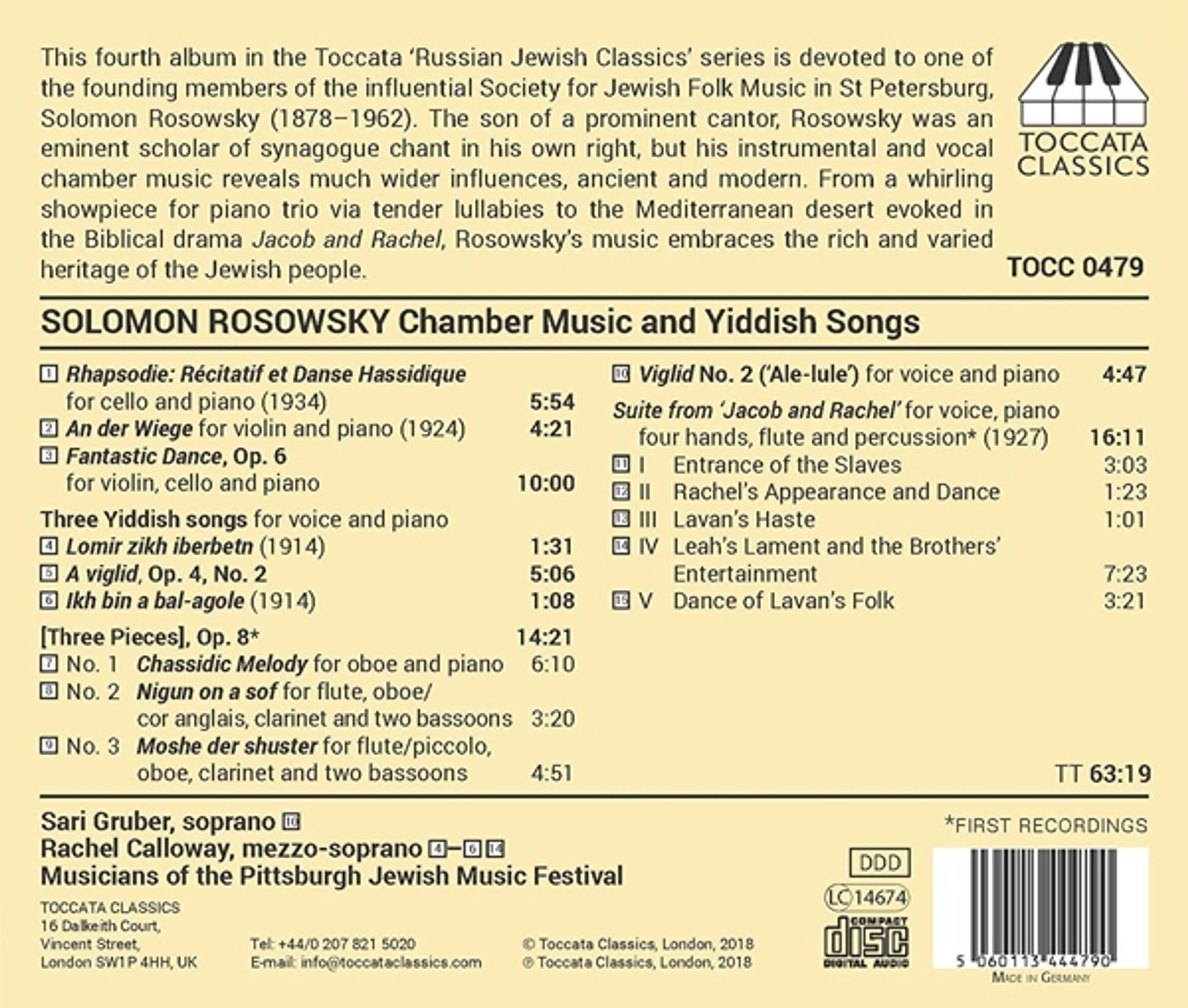 Von einem wirbelnden Prunkstück für Klaviertrio über zarte Schlaflieder bis hin zur Mittelmeerwüste, die im biblischen Drama Jakob und Rahel beschworen wird, umfasst Rosowskys Musik das reiche und vielfältige Erbe des jüdischen Volkes.