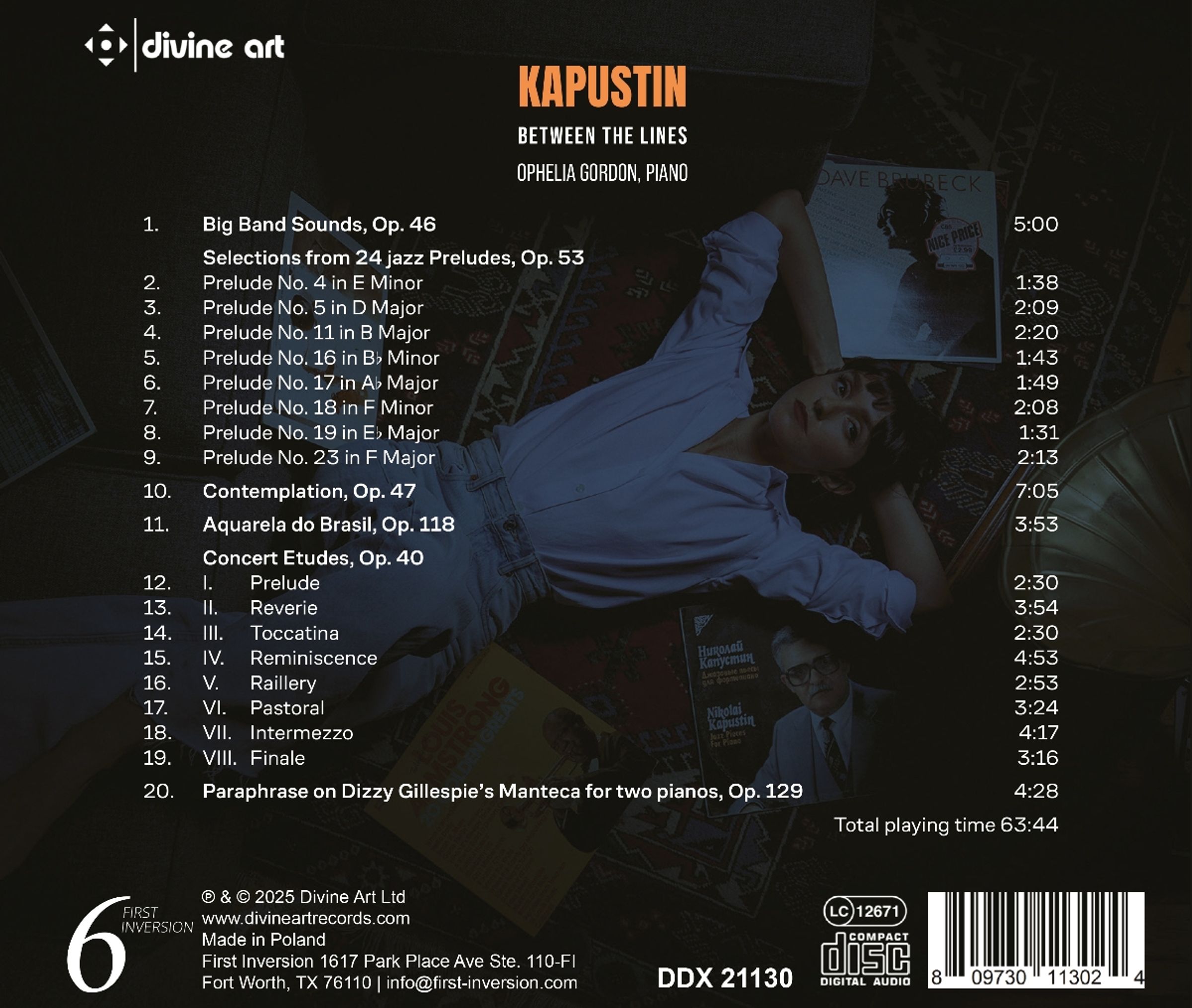 Die britische Pianistin Ophelia Gordon gibt mit diesem Album mit Werken von Nikolai Kapustin, einem sowjetischen Komponisten, dessen Musik die harmonische Sprache und den rhythmischen Drive des Jazz mit der formalen Präzision klassischer Kompositionen verbindet, ein beeindruckendes Debüt. Obwohl Kapustins Musik improvisiert klingt, ist jede Note sorgfältig komponiert – im Geist Jazz, aber in der Struktur klassisch. Gordon verleiht diesem Repertoire eine seltene Authentizität, da sie auf ihrer persönlichen Suche nach der wahren Stimme des Komponisten längst vergriffene Vinylaufnahmen von Kapustins eigenen Darbietungen aufgespürt hat. Das Programm ist sorgfältig zusammengestellt, um einen fesselnden Hörbogen zu bieten, der Kapustins Witz, Lyrik und Feuer mit Intimität und Flair einfängt. Gespielt auf einem charakteristischen Steinway D von 1961, ist der Klang des Albums warm, unmittelbar und detailreich. Es wurde mit einer Mikrofonanordnung aufgenommen, die die Unmittelbarkeit eines Jazz-Trios mit der Tiefe und Klarheit eines klassischen Solo-Klaviers in Einklang bringt.