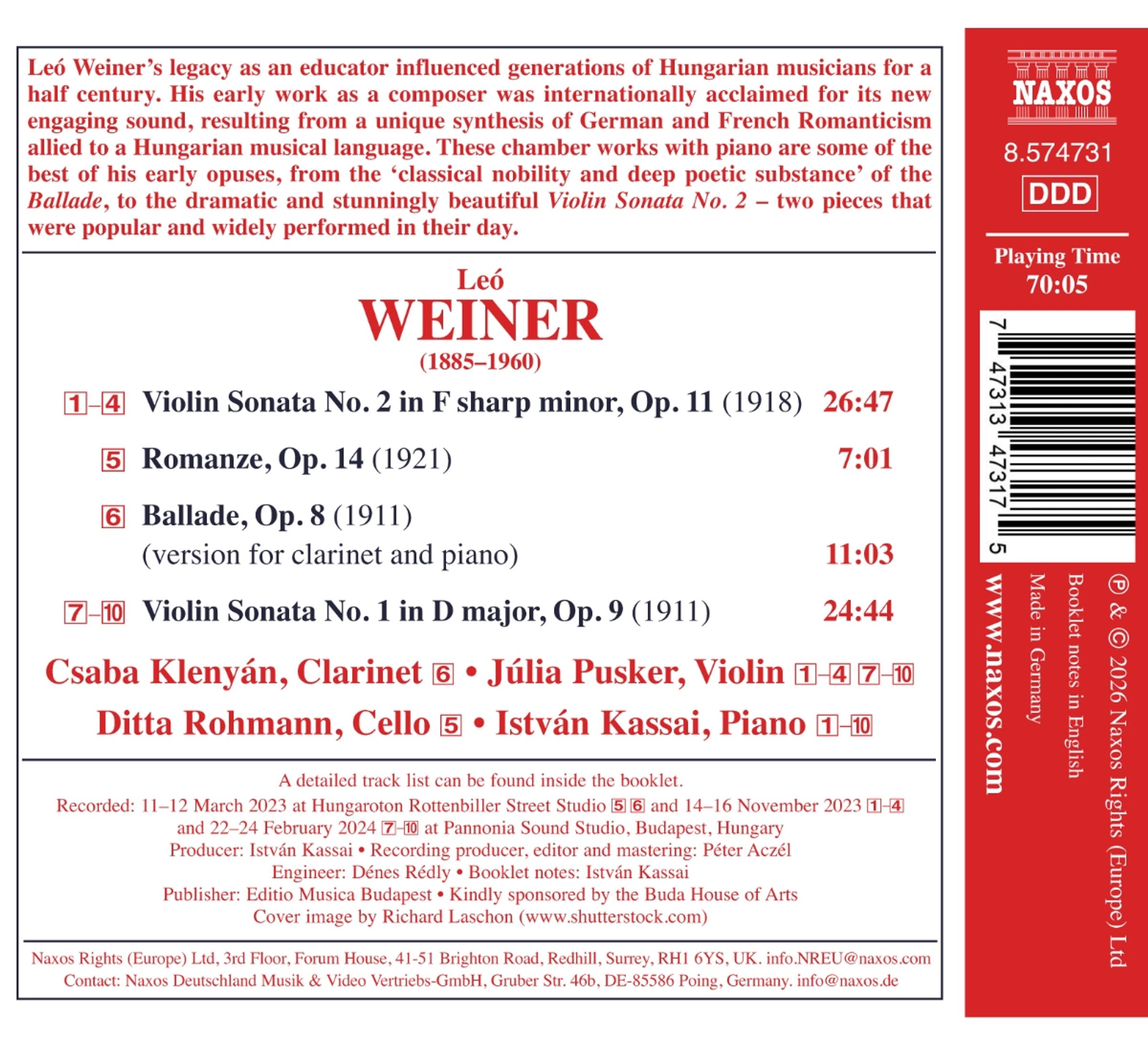 Leo Weiners Vermächtnis als Pädagoge beeinflusste ein halbes Jahrhundert lang Generationen ungarischer Musiker. Seine frühen Werke als Komponist wurden international für ihren neuen, mitreißenden Klang gefeiert, der aus einer einzigartigen Synthese deutscher und französischer Romantik in Verbindung mit einer ungarischen Musiksprache hervorging. Diese Kammermusikwerke mit Klavier gehören zu den besten seiner frühen Opera, von der „klassischen Noblesse und tiefen poetischen Substanz” der Ballade bis zur dramatischen und atemberaubend schönen Violinsonate Nr. 2 – zwei Stücke, die zu ihrer Zeit beliebt waren und häufig aufgeführt wurden.