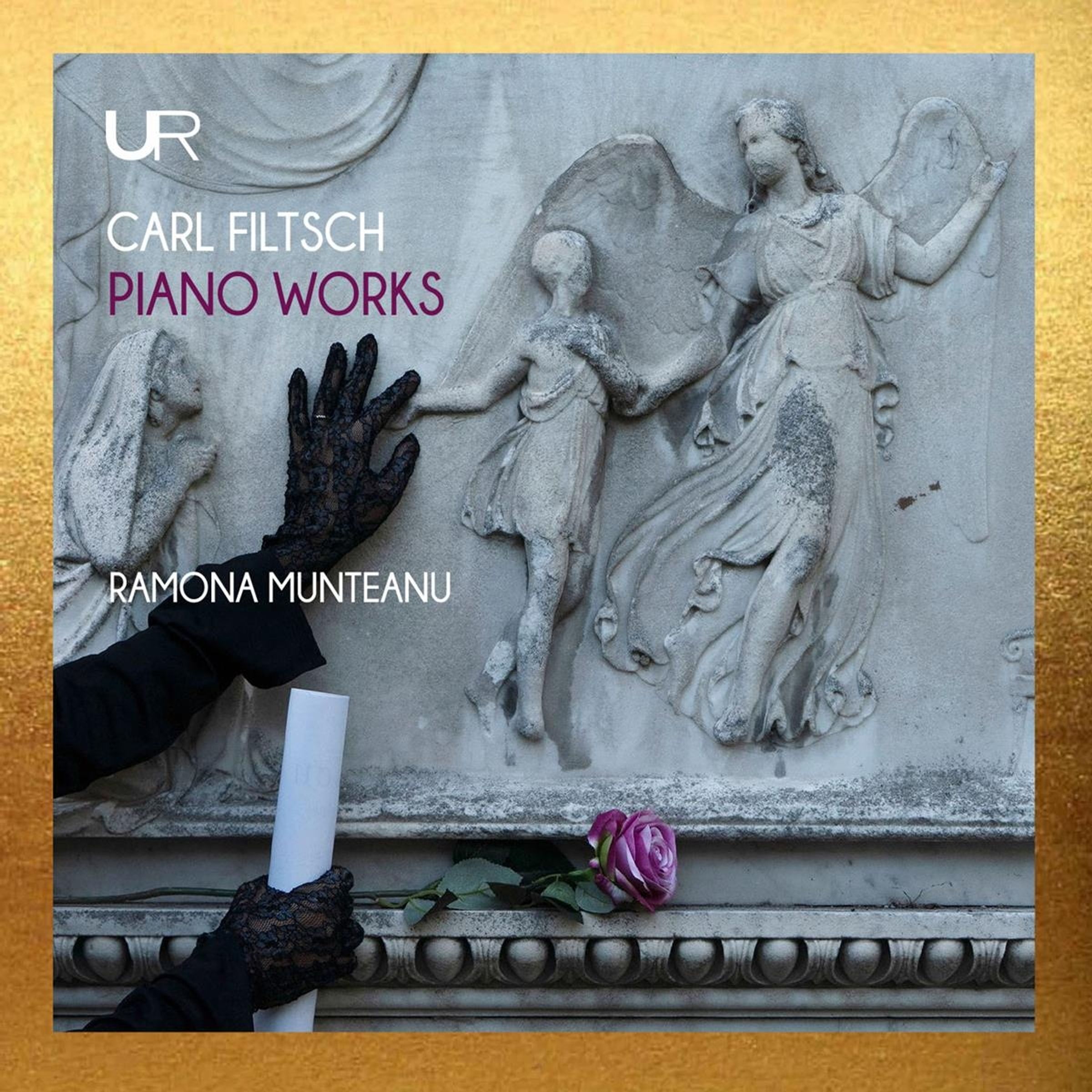 Text: "CARL FILTSCH PIANO WORKS RAMONA MUNTEANU". Bildhauerei von Engelsfiguren; Hand in schwarzem Handschuh, Rose, gerolltes Papier., CD