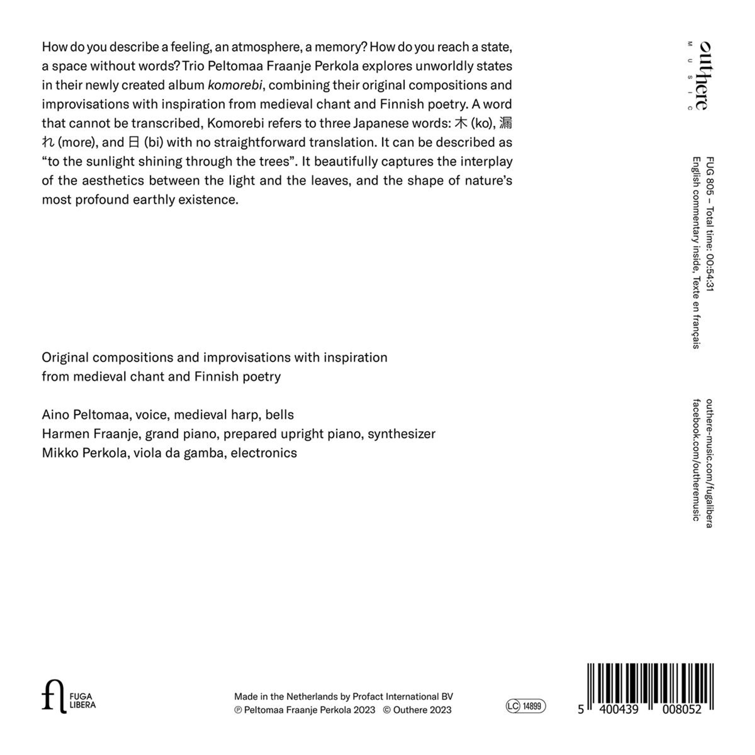 Wie beschreibt man ein Gefühl, eine Atmosphäre, eine Erinnerung? Wie erreicht man einen Zustand, einen Raum ohne Worte? Das Trio Peltomaa Fraanje Perkola erforscht mit seinem neuen Album "Komorebi" weltentrückte Zustände und kombiniert Originalkompositionen und Improvisationen mit Einflüssen aus mittelalterlichen Gesängen und finnischer Poesie. Komorebi bezieht sich auf drei Japanische Wörter -木 (ko), 漏れ (more) und 日(bi) -, für die es keine eindeutige Übersetzung gibt. Es kann als "zum Sonnenlicht, das durch die Bäume scheint" beschrieben werden. Es fängt das Zusammenspiel der Ästhetik zwischen dem Licht und den Blättern und die Form der tiefsten irdischen Existenz der Natur wunderbar ein. Peltomaa Fraanje Perkola ehrt mit diesem Album die Natur, die uns geblieben ist, und widmet die Musik der Schönheit, die wir um uns haben. Es appelliert an unsere Verantwortung gegenüber der Erde, damit auch nachfolgende Generationen Bäume, Blätter und deren Spiegelungen bewundern können.