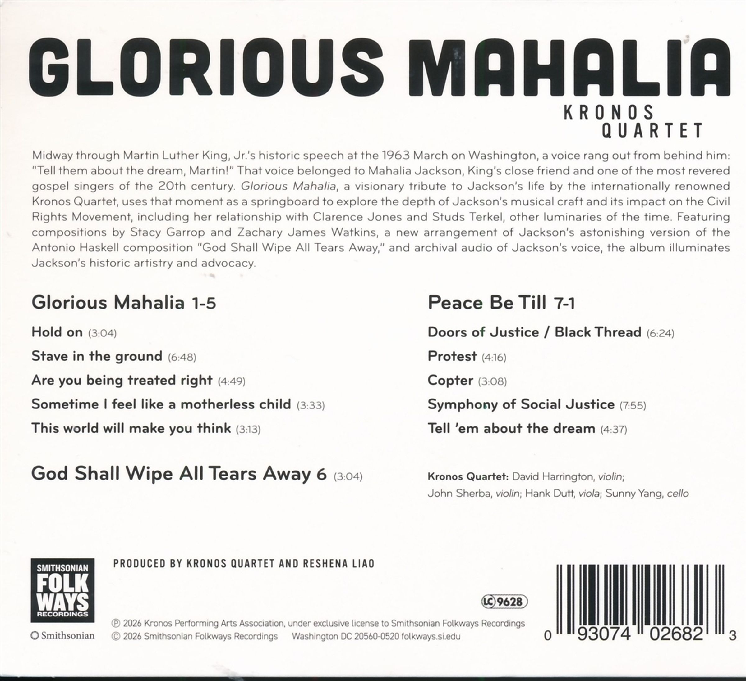 In der Mitte der historischen Rede von Martin Luther King Jr. beim Marsch auf Washington 1963 ertönte hinter ihm eine Stimme: „Erzähl ihnen von dem Traum, Martin!“ Diese Stimme gehörte Mahalia Jackson, einer engen Freundin von King und einer der angesehensten Gospelsängerinnen des 20. Jahrhunderts. Glorious Mahalia, eine visionäre Hommage an Jacksons Leben vom international renommierten Kronos Quartet, nutzt diesen Moment als Ausgangspunkt, um die Tiefe von Jacksons musikalischem Schaffen und dessen Einfluss auf die Bürgerrechtsbewegung zu erkunden, einschließlich ihrer Beziehung zu Clarence Jones und Studs Terkel, weiteren Persönlichkeiten dieser Zeit. Mit Kompositionen von Stacy Garrop und Zachary James Watkins, einem neuen Arrangement von Jacksons erstaunlicher Version des Antonio-Haskell-Stücks „God Shall Wipe All Tears Away“ und Archivaufnahmen von Jacksons Stimme beleuchtet das Album Jacksons historische Kunstfertigkeit und ihr Engagement.