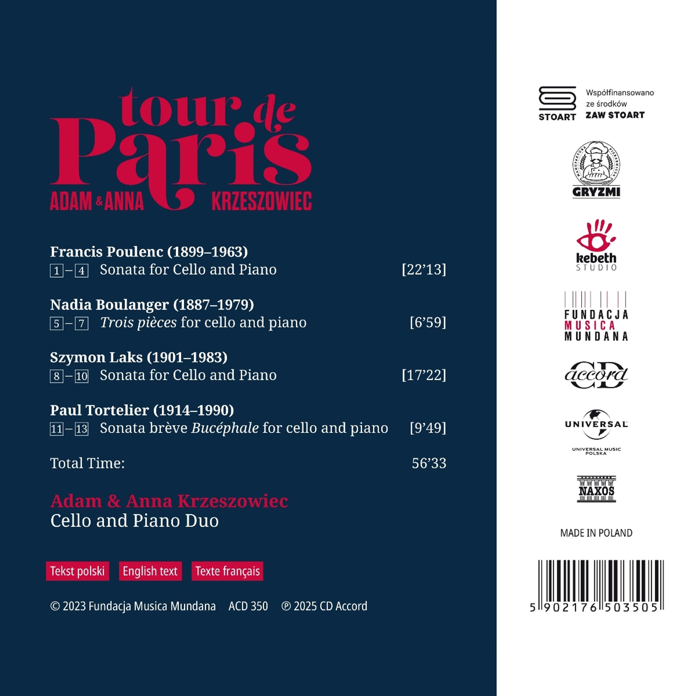 Spaziergänge in Paris werden durch die unzähligen Plätze dieser Stadt noch angenehmer – mit Bänken im Schatten von Platanen, verwinkelten Gehwegen und einer nostalgischen Atmosphäre. Diese Orte erinnern mit ihren Namen auch an Politiker, Gelehrte und Künstler, die in der französischen Hauptstadt tätig waren, darunter die Protagonisten dieses Albums – Nadia Boulanger, Francis Poulenc und Paul Tortelier. Simon (Szymon) Laks hat zwar keinen eigenen Platz, aber auch er war mit Paris verbunden, wo er einige der glücklichsten Jahre seines Lebens verbrachte. Die Musiker Anna und Adam Krzeszowiec sind im Leben und auf der Bühne ein Paa und begannen ihre gemeinsamen Auftritte im Jahr 2010. Die größte Freude finden sie in der Interpretation von Meisterwerken der Kammermusik (Ludwig van Beethoven, Johannes Brahms, Franz Schubert), gleichzeitig entdecken sie weniger bekannte Musik und präsentieren sie auf Bühnen im In- und Ausland. Ihr Repertoire ist eine faszinierende Reise durch die Epochen – von der Klassik bis zur zeitgenössischen Komposition. Adam, einer der führenden Cellisten der jungen Generation, wurde zum Solocellisten des Polnischen Nationalen Rundfunk-Sinfonieorchesters (NOSPR) ernannt. Darüber hinaus tritt er als Solist und Kammermusiker auf polnischen und internationalen Bühnen auf, auch als Mitglied des international anerkannten Polnischen Celloquartetts. Anna, eine Pianistin, die sich der Kammermusik verschrieben hat, tritt regelmäßig in verschiedenen Instrumentalensembles auf. Sie arbeitet mit Musikern zusammen, die sich auf internationale Musikwettbewerbe vorbereiten, und wird als gefragte musikalische Partnerin und Lehrerin immer wieder von Institutionen wie dem NOSPR, der Cavatina Hall, der Schlesischen Philharmonie und der Internationalen Celloakademie eingeladen.
