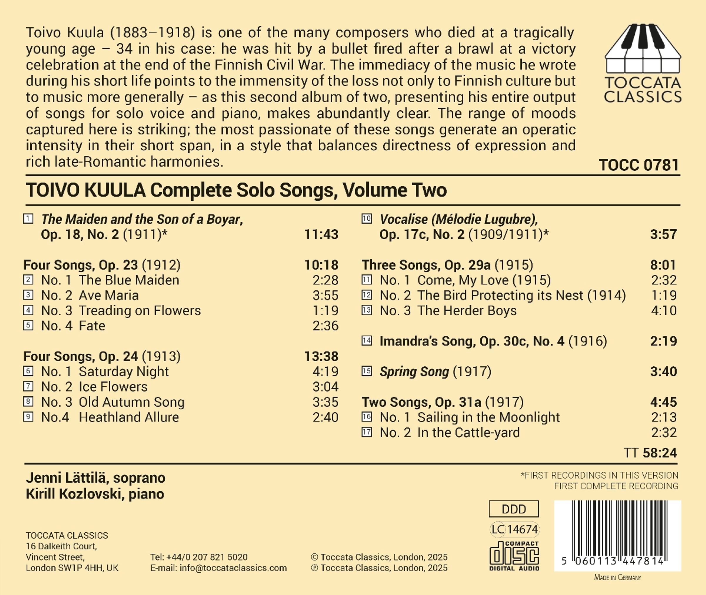 Toivo Kuula ist einer der vielen Komponisten der Romantik und Spätromantik, die tragisch in jungem Alter starben - in seinem Fall mit 34 Jahren: Er wurde von einer Kugel getroffen, die nach einer Rangelei bei einer Siegesfeier am Ende des finnischen Bürgerkriegs abgefeuert wurde. Die Unmittelbarkeit der Musik, die er während seines kurzen Lebens komponierte, verdeutlicht das immense Ausmaß des Verlustes nicht nur für die finnische Kultur, sondern für die Musik im Allgemeinen - wie dieses zweite und letzte Album, das sein gesamtes Werk an Liedern für Solostimme und Klavier präsentiert, deutlich macht. Die Bandbreite der hier eingefangenen Stimmungen ist beeindruckend; die leidenschaftlichsten dieser Lieder erzeugen in ihrer kurzen Spanne eine opernhafte Intensität, in einem Stil, der die Direktheit des Ausdrucks und die reichen spätromantischen Harmonien in Einklang bringt.