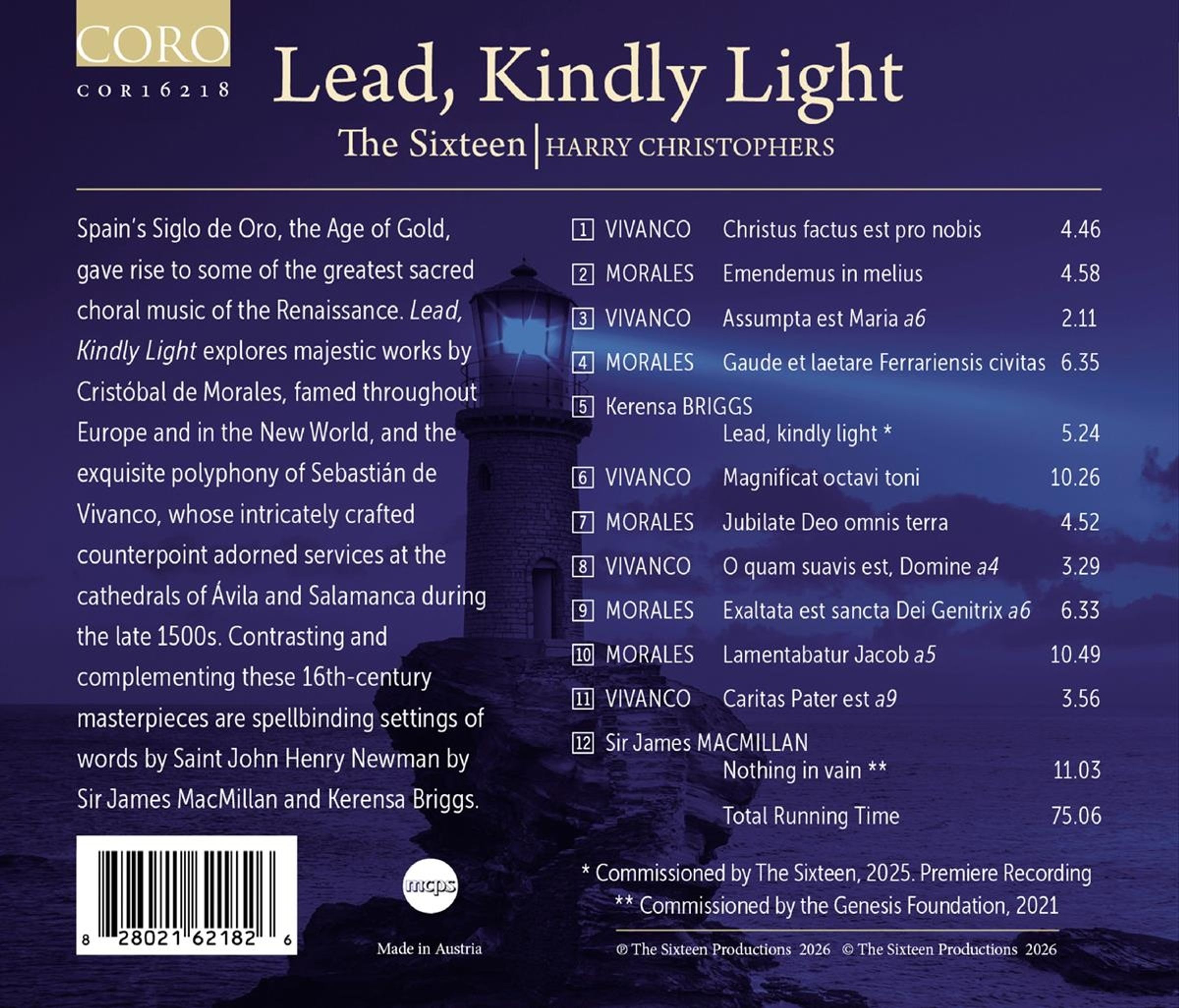 Spaniens »Siglo de Oro« (Goldenes Zeitalter) brachte einige der großartigsten geistlichen Chorwerke der Renaissance hervor. Lead, Kindly Light widmet sich der Musik zweier herausragender spanischer Komponisten und erkundet die majestätischen Werke von Cristóbal de Morales, der in ganz Europa und in der Neuen Welt berühmt war, sowie die exquisite Polyphonie von Sebastián de Vivanco, dessen kunstvoll gestalteter Kontrapunkt Ende des 16. Jahrhunderts die Gottesdienste in den Kathedralen von Avila und Salamanca schmückte. Im Kontrast zu diesen Meisterwerken des 16. Jahrhunderts stehen die faszinierenden Vertonungen von Texten des Heiligen John Henry Newman: Sir James MacMillans Nothing in Vain für Solisten und Doppelchor und die Weltpremiere von Kerensa Briggs Lead, kindly light, das speziell für die Choral Pilgrimage 2026 von The Sixteen in Auftrag gegeben wurde.