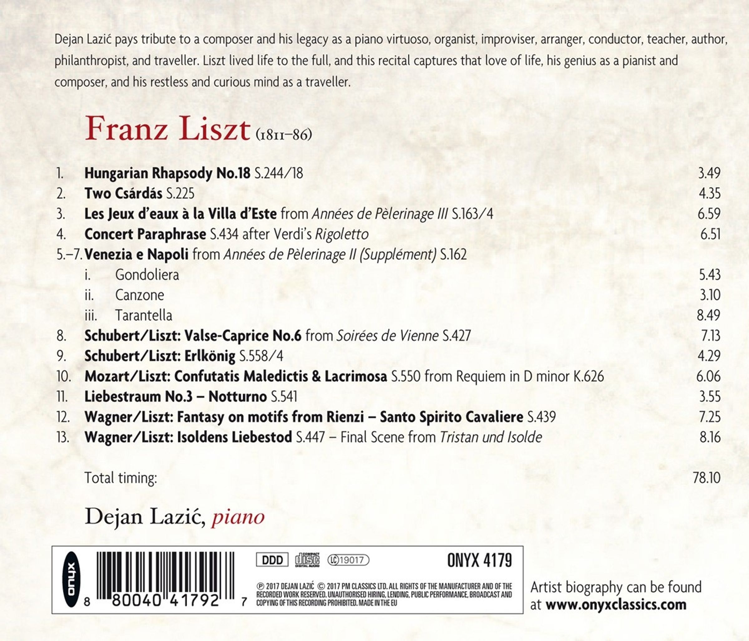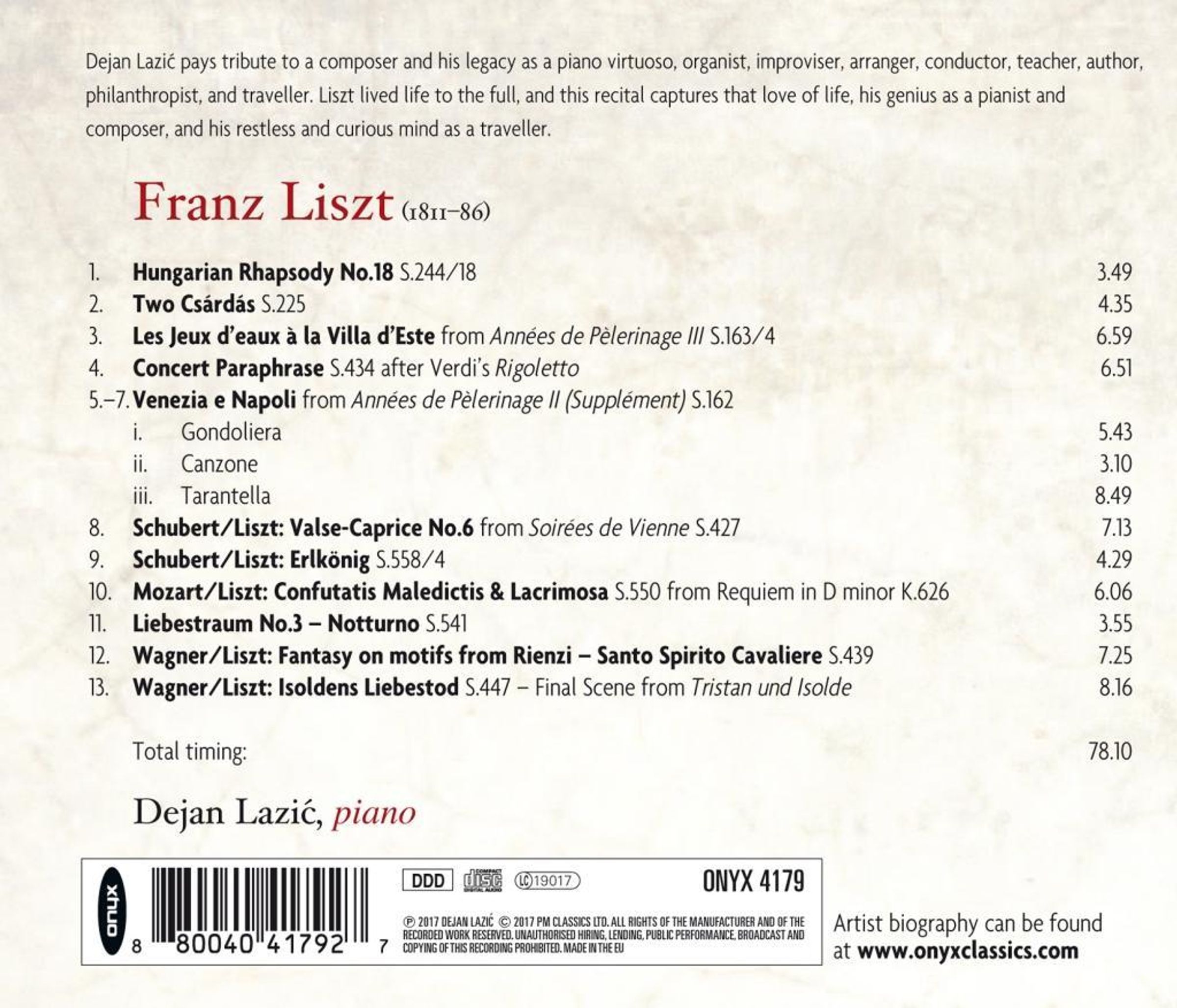 »Grandios fingerfertig, engagiert und gewitzt, dabei voller Tiefgang: Dieser Längsschnitt durch Liszts Oeuvre ist ein Geschenk, für Einsteiger wie für Kenner.« (Literatur Spiegel 06/2017)»Dejan Lazić entwirft ein klingendes Lebensbild, dessen Stationen Ungarn, Österreich, Italien und Deutschland Franz Liszt als den europäischen Universalbotschafter des Klaviers erkennen lassen. (...) Klanggewaltig, farbenreich und transparent artikuliert zielen seine Liszt-Deutungen weniger auf Show-Effekt denn auf lyrische Verdichtung – eine wunderbare Leistung und für den Liszt-Einsteiger wie für den Connaisseur ein Genuss!« (Fono Forum, September 2017)