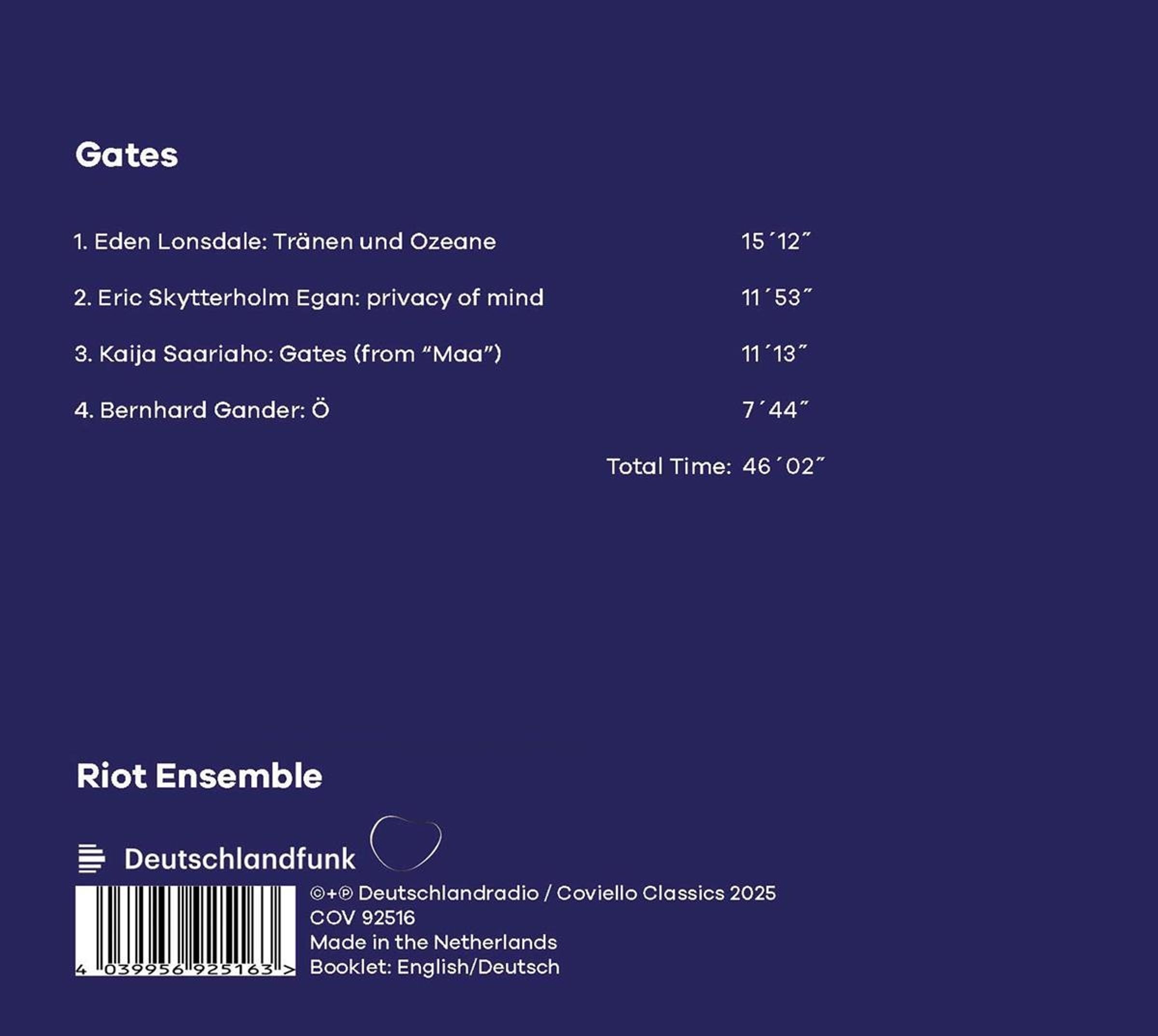 Mit Gates präsentiert das Riot Ensemble ein fesselndes Statement zeitgenössischer Ensemblekunst. Das Album vereint Werke von Eric Skytterholm Egan, Eden Lonsdale, Kaija Saariaho und Bernhard Gander und erkundet das Spannungsfeld zwischen Ordnung und Chaos, Struktur und Exzess, historischer Referenz und radikaler Gegenwart.