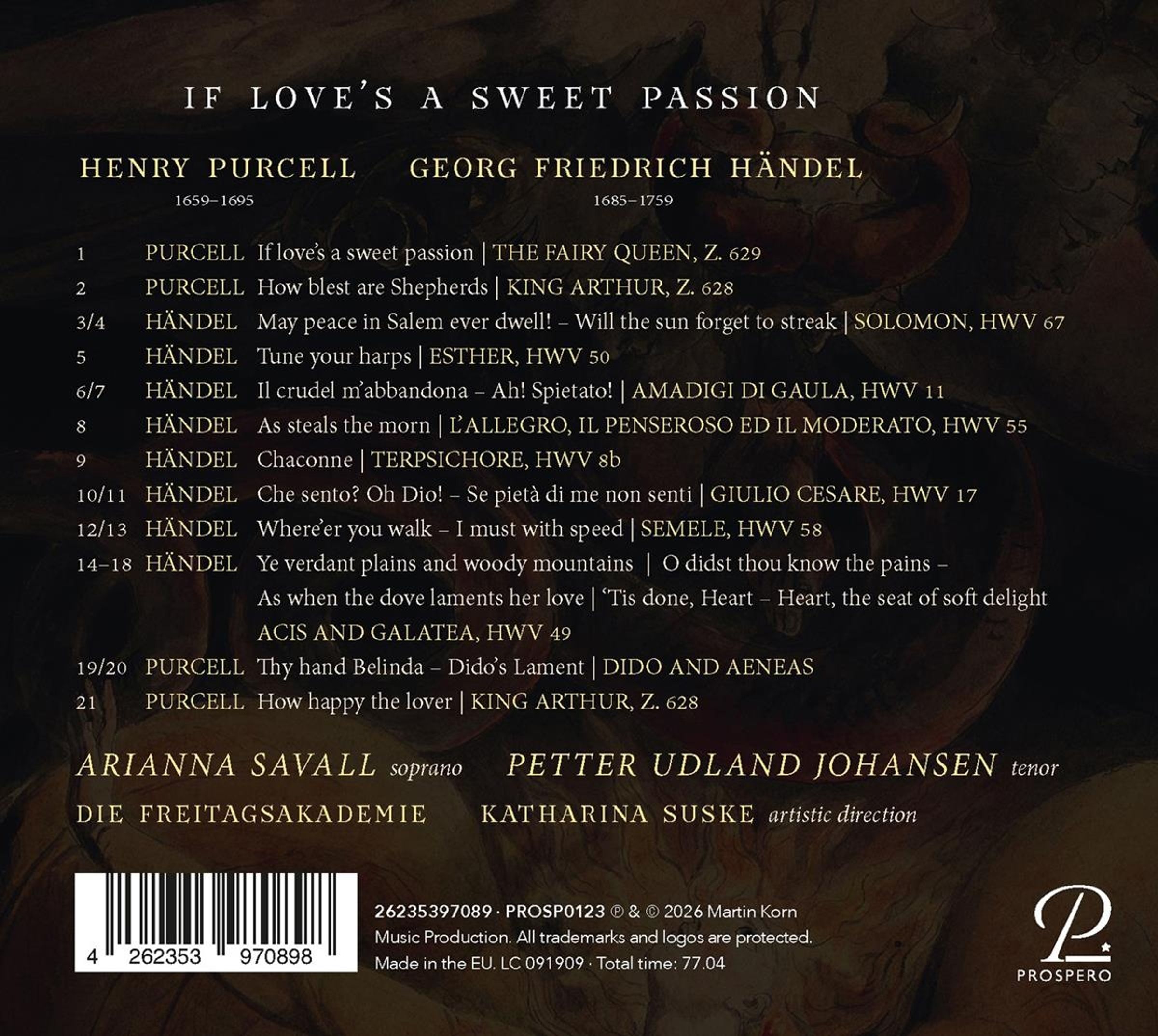 +Georg Friedrich Händel: May peace in Salem ever dwell! - Will the sun forget to streak aus "Solomon"; Tune your harps aus "Esther"; Il crudel m'abbandona - Ah! Spietato" aus "Amadigi di Gaula"; As steals the morn aus "L'Allegro, il Penseroso ed il Moderato"; Chaconne aus "Terpsichore"; Che sento? Oh Dio! - Se pieta di me non senti aus "Giulio Cesare"; Were'er you walk - I must with speed aus "Semele"; Ye verdant plains and woody mountains, O didst thou know the pains, As when the dove laments her & 'Tis done, Heart - Heart, the seat of soft delight aus "Acis and Galatea"