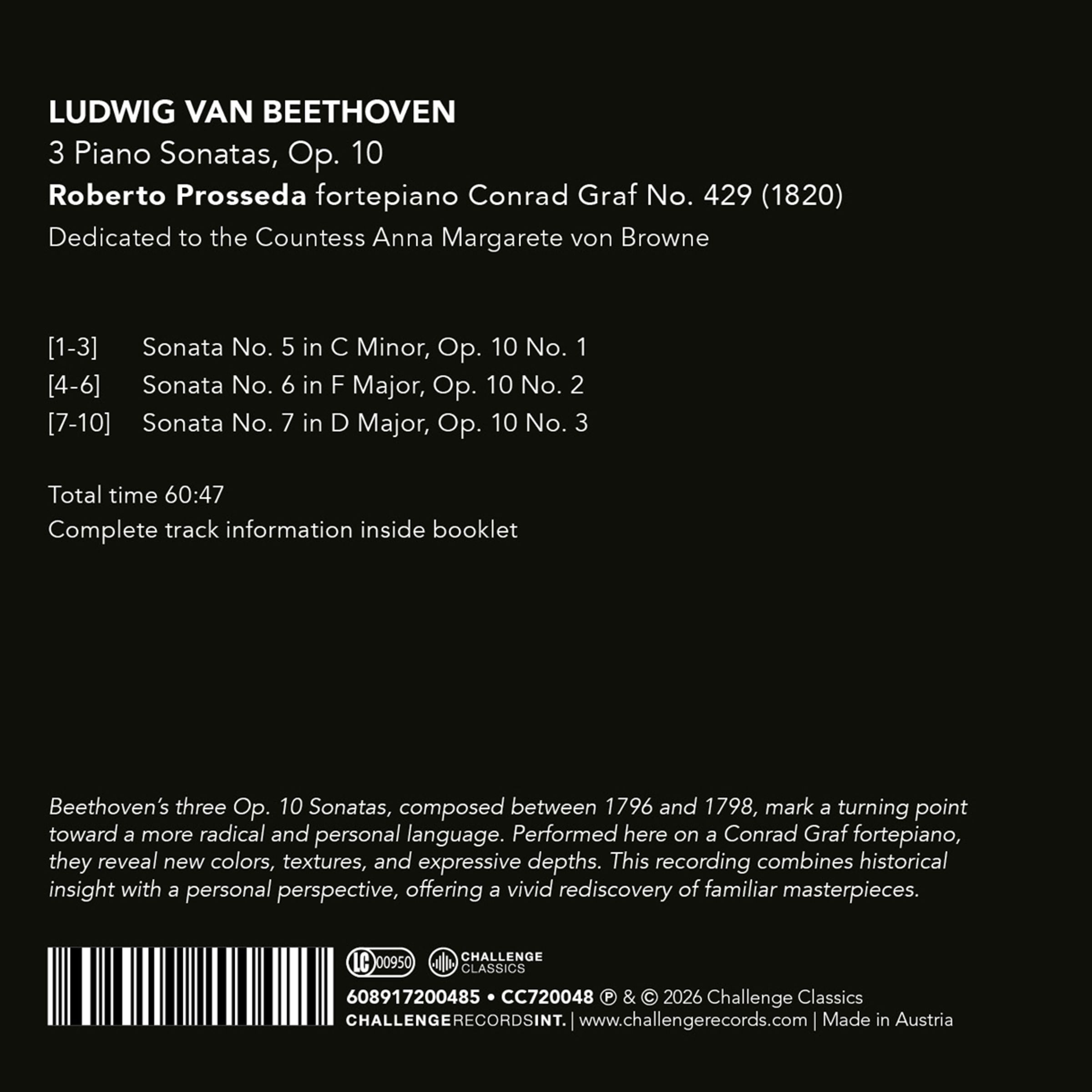 Beethovens drei Sonaten op. 10, komponiert zwischen 1796 und 1798, markieren einen entscheidenden Schritt weg von der klassischen Klarheit Haydns und Mozarts hin zu einer kühneren, individuelleren Sprache. Jede Sonate hat einen eigenen Charakter: Die c-Moll-Sonate Nr. 1 verbindet tragische Dringlichkeit mit struktureller Konzentration; die F-Dur-Sonate Nr. 2 offenbart Beethovens aufkeimenden Humor und seine rhythmische Erfindungsgabe; und die expansive D-Dur-Sonate Nr. 3 entfaltet eine beispiellose emotionale und architektonische Dimension, gekrönt vom visionären Largo e mesto. Das verbindende rhythmische Motiv „kurz-lang” zieht sich durch das gesamte Werk und lässt die späteren Dramen des Komponisten erahnen. Roberto Prossedas Interpretation, gespielt auf einem Conrad-Graf-Hammerflügel von 1820, stellt die rohen Kontraste, sprechenden Klangfarben und anti-rhetorischen Gesten der Musik wieder her, die moderne Klaviere oft glätten.