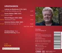 elementare sowie zeitlose Empfindungen der CD Urgedanken zugrunde. Der renommierte Tenor Christian Elsner spannt in seinem neuen Album musikalisch wie thematisch den Bogen von Beethoven über Mahler und Wagner bis zu Brahms. In den Liederzyklen werden Worte, Gedanken und Gefühle in Töne gefasst, die auch heute noch für die Menschen von größter Bedeutung sind. Man könnte sagen, es geht um nicht weniger als die Grundfragen des Seins, ausgedrückt in Musik und Worten.