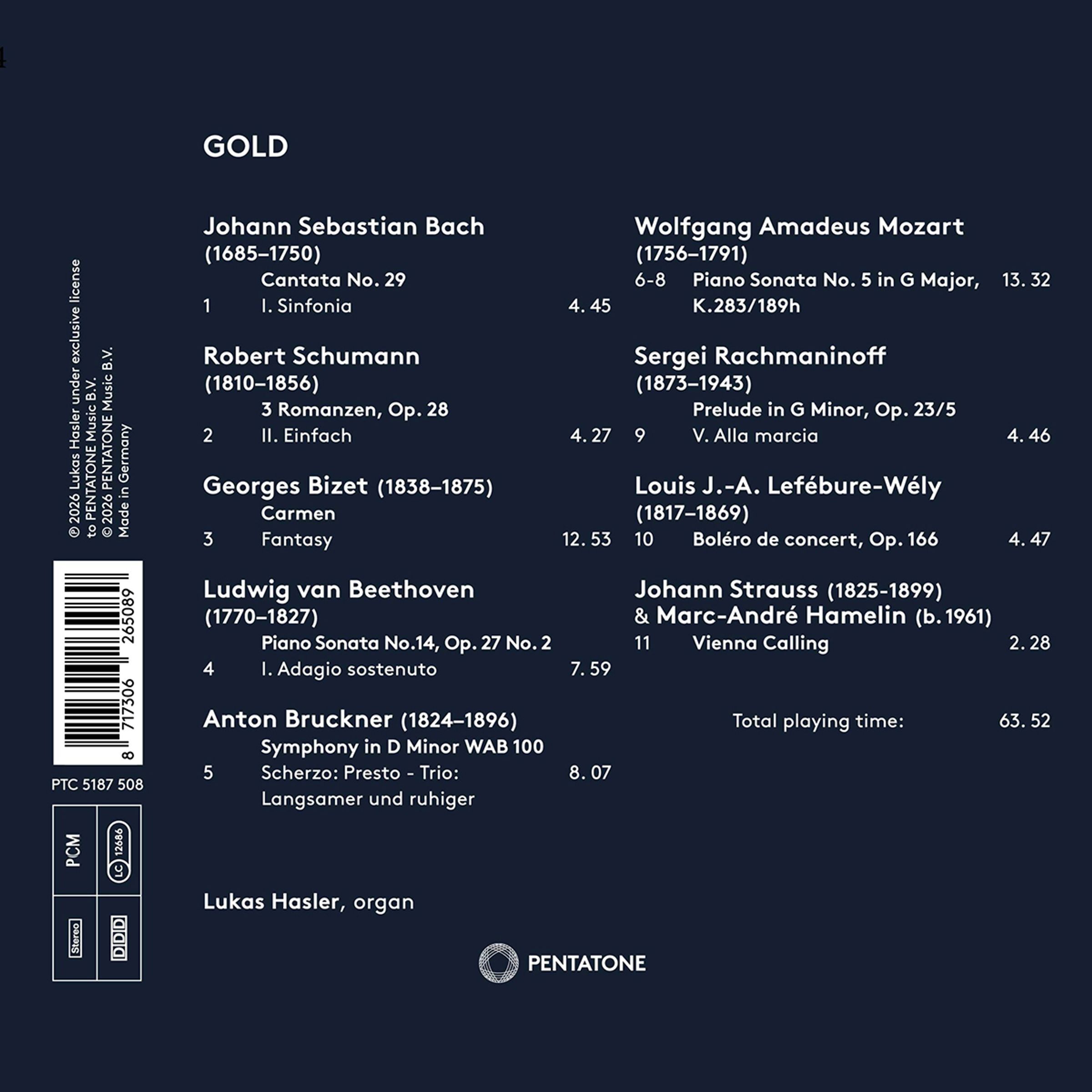 „Gold“ bietet ein reichhaltiges Spektrum an Farben und Stilen, von der jubelnden Brillanz von Johann Sebastian Bachs „Sinfonia“ (in Duprés lebhafter Transkription) bis zur zarten Intimität von Robert Schumanns „Romanze“, die hier zum ersten Mal auf der Orgel aufgenommen wurde. Hasler verleiht Edwin H. Lemares Arrangement von „Carmen Fantasy“ Theater-Flair, Ludwig van Beethovens „Mondschein“-Adagio wird mit großer Ruhe bedacht und Anton Bruckners „Nullte Scherzo“ mit sinfonischer Vitalität, während Mozarts „G-Dur-Sonate“ – gefiltert durch Edvard Griegs Fantasie und Haslers eigene Kunstfertigkeit – eine Brücke zwischen klassischer Klarheit und romantischer Wärme schlägt. Sergei Rachmaninoffs stürmisches „Prélude“, Louis J.-A. Lefébure-Wélés funkelnder „Boléro“ und das verspielte, genreübergreifende „Vienna Calling“ vervollständigen ein Programm, das Erfindungsreichtum, Persönlichkeit und den goldenen Reichtum des Wiener Orgelklangs feiert.
