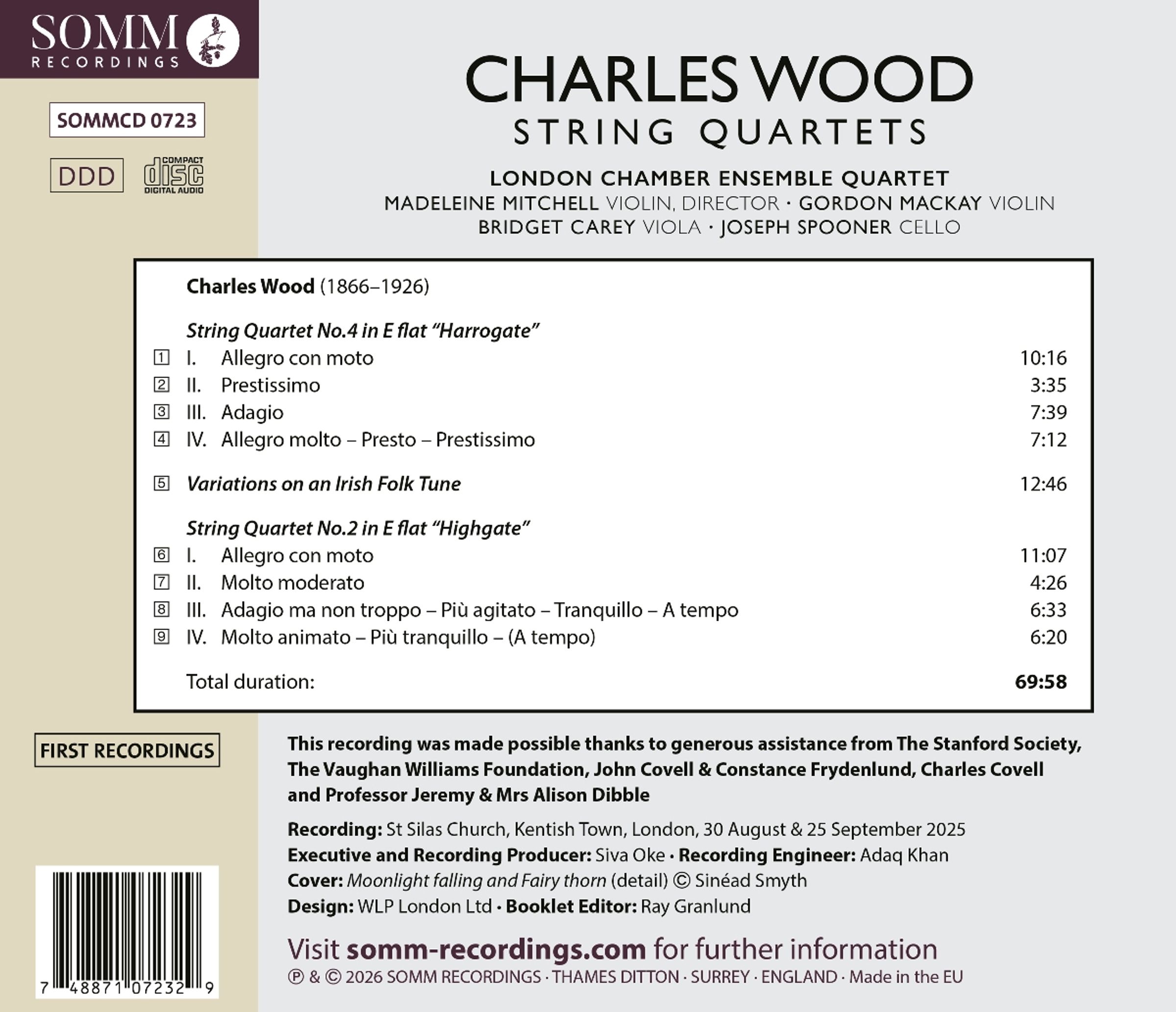 Anlasslich des 100. Todestages des in Irland geborenen Komponisten Charles Wood (1866 - 1926) erscheint die Weltersteinspielungen seines Streichquartetts Nr. 2 "Highgate" und seines Streichquartetts Nr. 4 "Harrogate" zusammen mit seinen "Variationen uber eine irische Volksweise". Dies folgt auf die Veroffentlichung von Woods sechstem und letztem Streichquartett in einer Auffuhrung durch das London Chamber Ensemble Quartet. Das London Chamber