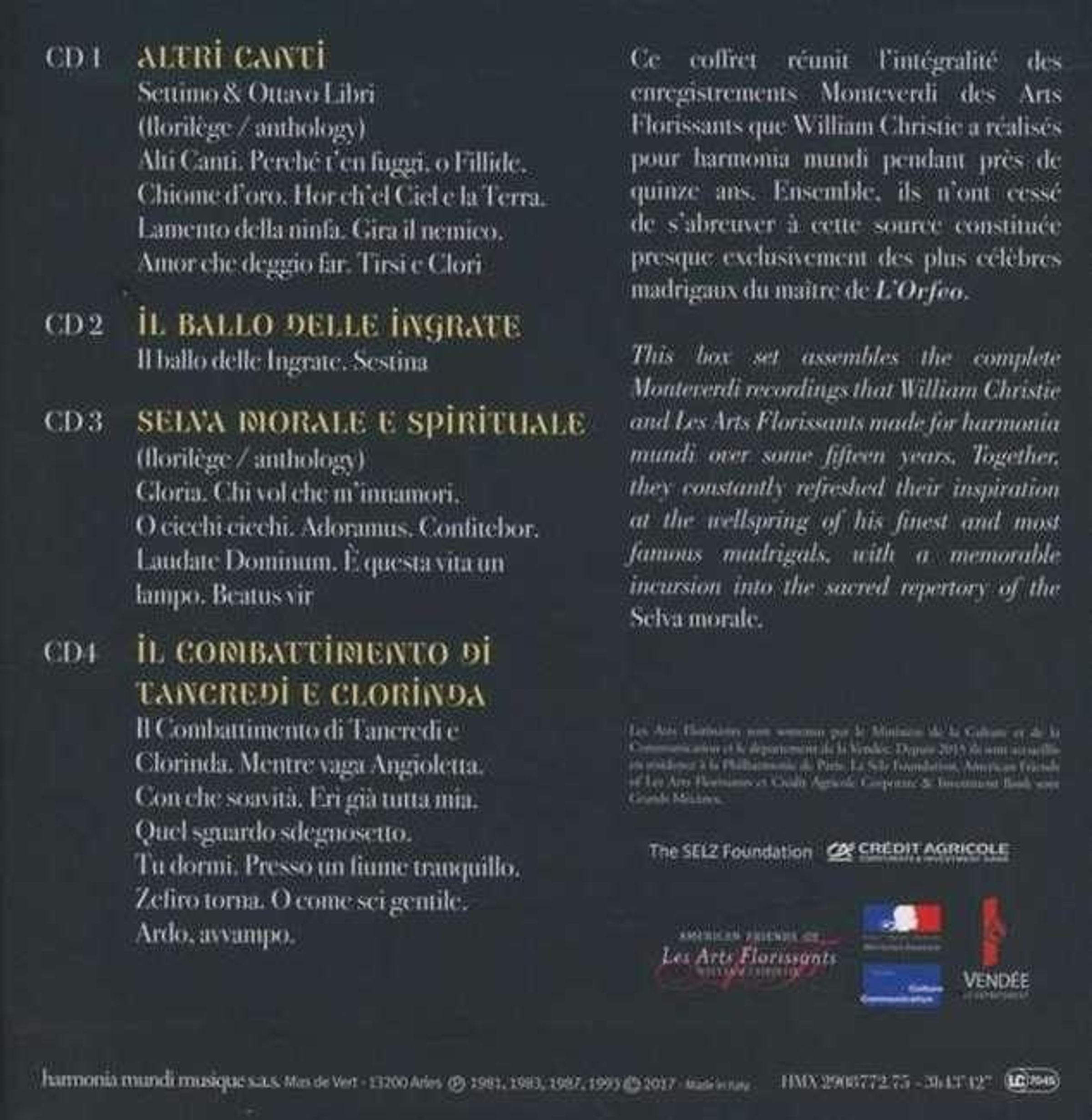 Diese schöne Box enthält sämtliche Monteverdi-Aufnahmen, die William Christie und Les Arts Florissants im Lauf von etwa 15 Jahren für harmonia mundi gemacht haben. Christie und seine Sänger haben sich immer wieder von dieser unerschöpflichen Quelle der schönsten und berühmtesten Madrigale inspirieren lassen, wagten aber auch einen unvergesslichen Ausflug in Monteverdis geistliche Sammlung »Selva Morale«.