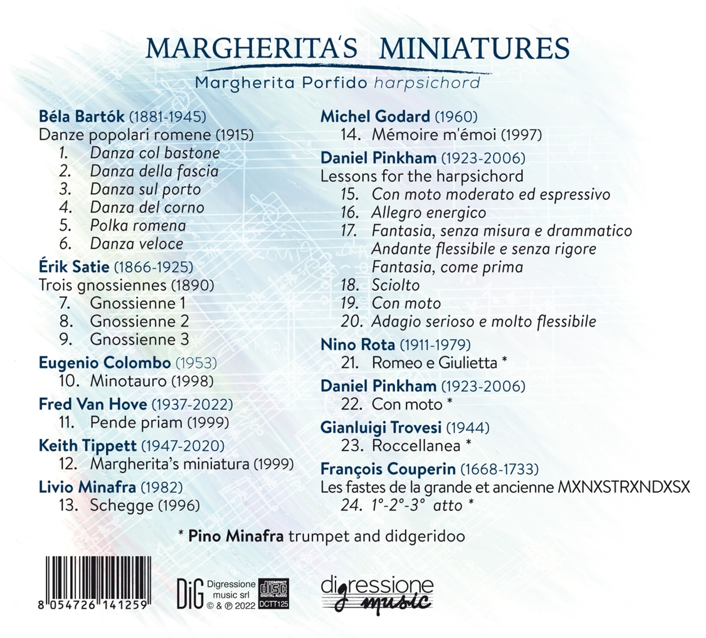Der Titel, den ich meiner Aufnahme zeitgenössischer Musik für Cembalo geben wollte, spricht von Miniaturen, aber ich möchte den Hörer nicht zu der Annahme verleiten, dass es sich um kleine Musik handelt. Natürlich überlasse ich es der Nachwelt, zu entscheiden, ob es große Musik sein wird! Ich will nur sagen, dass diese CD mehrere Kompositionen für das neue Cembalo enthält, als wären es kleine Gemälde, Miniaturen, und so, wie der Maler alle Farben seiner Palette verwenden würde, von den zartesten bis zu den dunkelsten, von den wärmsten bis zu den kältesten, so wollte ich auch den Weg der Musik, die darin enthalten ist, in Gedanken an farbige Klangbilder aufbauen. Ich habe mir zum Ziel gesetzt, das Cembalo in die zeitgenössische Welt zu bringen und es der Feder großer aktueller Komponisten anzuvertrauen, die aus verschiedenen musikalischen Richtungen kommen, von der Klassik über die zeitgenössische Musik bis hin zum Jazz, wie diejenigen, die auf dieser CD zu hören sind, denn ich glaube, dass das Cembalo immer noch sehr aktuell ist und dass sein Klang auch jetzt noch erforscht werden muss. (Margherita Porfido)