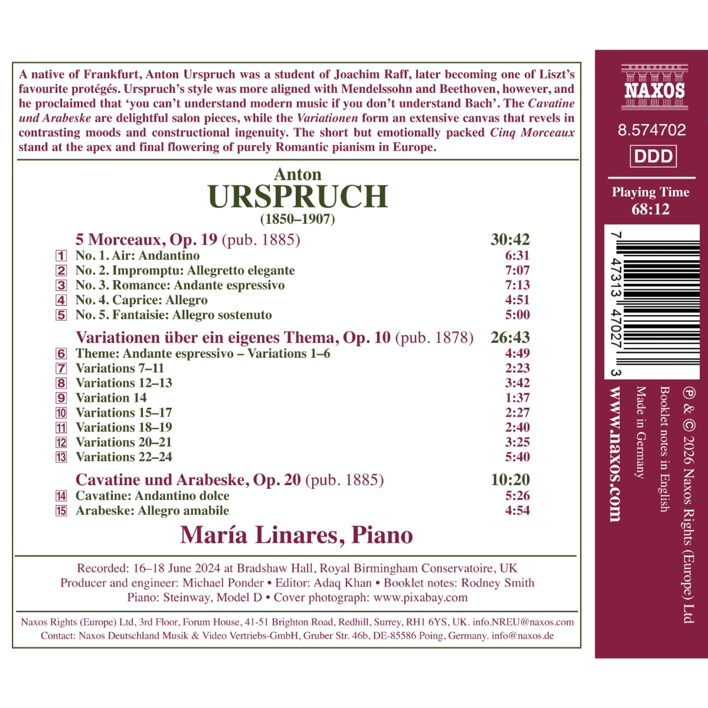 Der aus Frankfurt stammende Anton Urspruch war Schüler von Joachim Raff und wurde später einer der Lieblingsschüler Liszts. Urspruchs Stil war jedoch eher mit Mendelssohn und Beethoven vergleichbar, und er verkündete, dass „man moderne Musik nicht verstehen kann, wenn man Bach nicht versteht“. Die Cavatine und Arabeske sind reizvolle Salonstücke, während die Variationen eine umfangreiche Komposition bilden, die sich durch kontrastreiche Stimmungen und konstruktive Genialität auszeichnet. Die kurzen, aber emotional dichten Cinq Morceaux stehen an der Spitze und bilden die letzte Blüte des rein romantischen Klavierspiels in Europa.