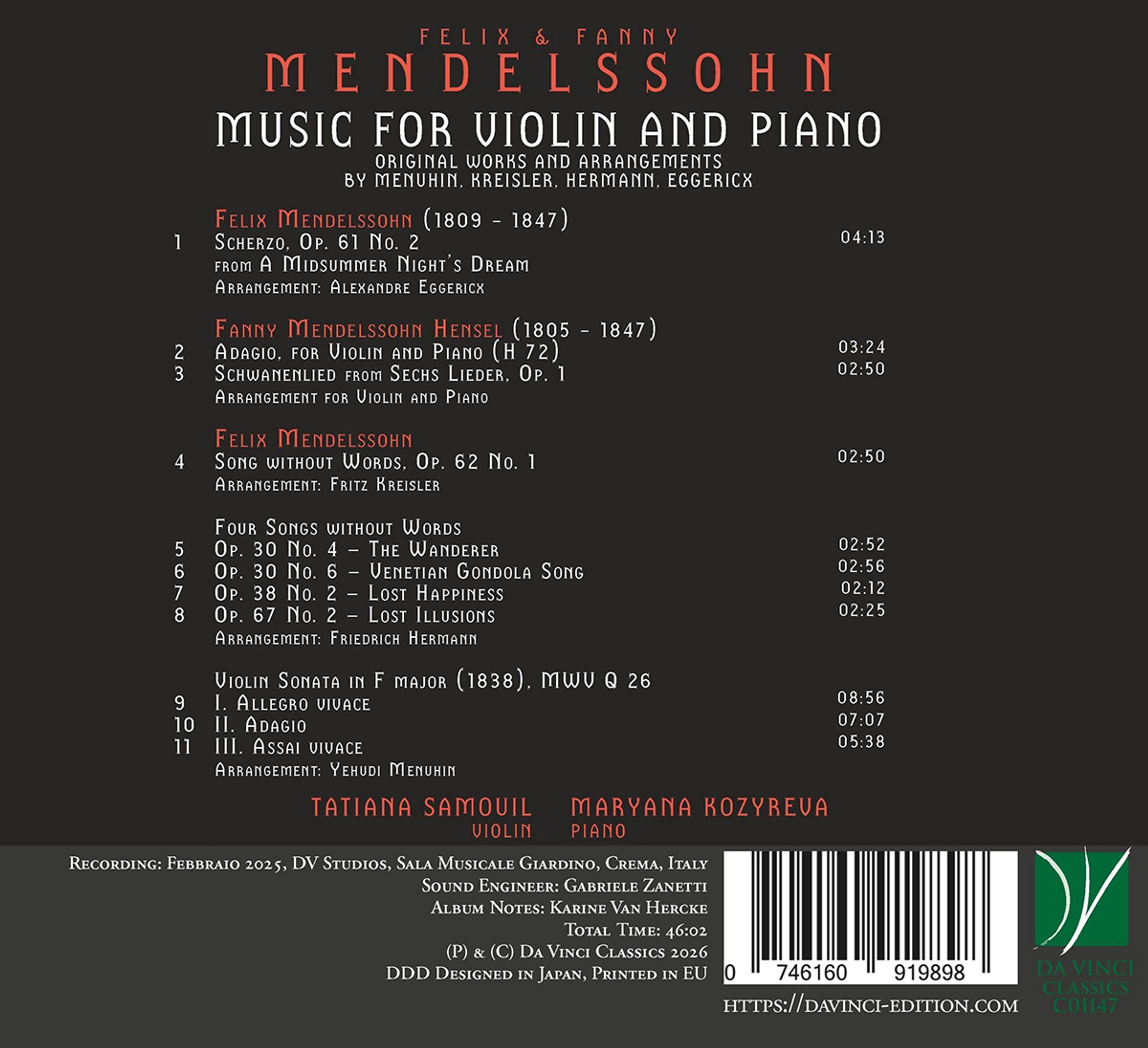 Violinsonate F-Dur (1838); Scherzo op. 61 Nr. 2 (aus Ein Sommernachtstraum); Lieder ohne Worte op. 30 Nr. 4 & 6; op. 38 Nr. 2; op. 62 Nr. 1; op. 67 Nr. 2
